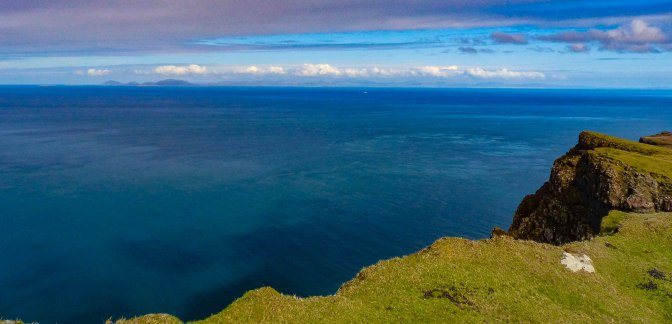 We were headed for a small hill which I hoped would give us the views we were hoping for but as we crested the first one all we saw was another hill ahead. There were three of these false summits which blocked the view of our final and still distant destination -Dunvegan Head itself. Relief beyond belief when we finally crested the third minor hill of this route and got a view out to our objective – which was still miles away. But at least we could now see the best route, getting ourselves off this awful ground and down to the emerald grass that lined the cliff edge.It would also be great to be down above the ocean rather than stuck up here, miles away.