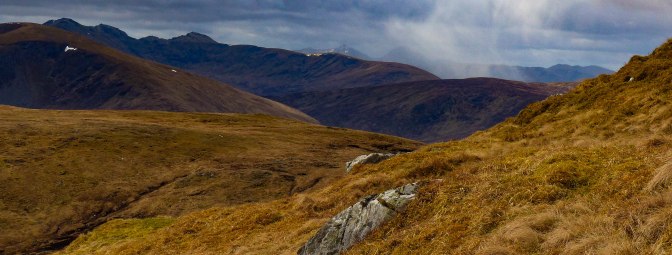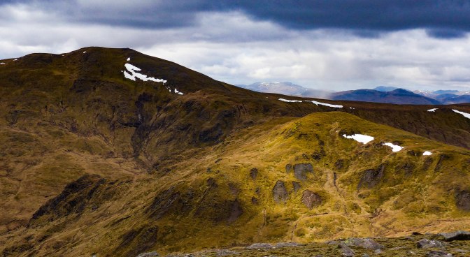 Even better, the views were starting to open up to the south with the Ben Lawers group looking superb.In fact, the view over a fair chunk of the Southern Highlands was mesmerising.We seemed, too, to be escaping some hefty showers – some of them carrying snow – but it all made for dramatic and ever-changing light and colours.