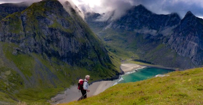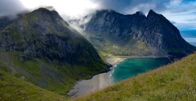 The final summit of Ryten lay ahead, reached by a big wide grassy hillside with sheer cliffs to our left. The hill was really busy ahead.The sun had come out too, though cloud was still swirling around the higher peaks above the beach. Our first view of Kvalvika, 500m below, soon opened up and wow, what an incredible sight. Steep sided mountains framed the double beaches on either side, impossibly steep. Crystal clear turquoise water lapped the shores. Further out, the Norwegian sea was deepest blue.A stunning vista.