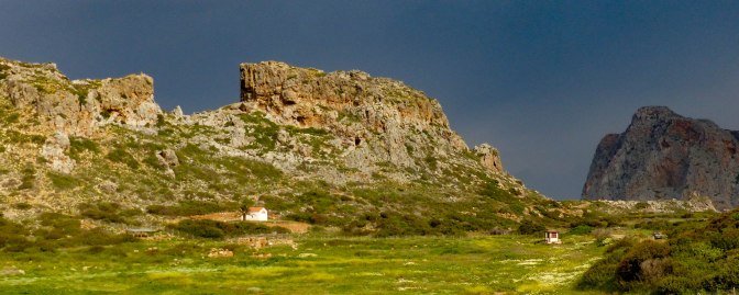 Our trip to Crete ended very close to where it had begun on Day 1.We had a bit of time to spare and at 6pm, the dullish day had turned sunny and warm. Chris was keen to just push on to the airport but I didn’t fancy spending an extra hour there on such a nice day. By chance, I spied a minor road heading off the main drag to the airport which looked as if it went down to the shore of Soudha Bay. It was very close to the War Cemetery, a tiny cove with a jetty where, bizarrely, a couple of plastic chairs had been left upside down and there were the remains of some decrepit sunshades. Ready made seats, just waiting for us! We’d already picked up some chicken drumsticks, Parma ham, bread and coleslaw at a supermarket in Chania for snacking on before the flight but instead, enjoyed a little al fresco picnic surrounded by wildflowers and the sound of the sea. The Lefka Ori had cleared of mist and looked splendid across the bay. It was a fitting send off from the island and we both wished it ‘kalispera.’ Perhaps one day, we will return.