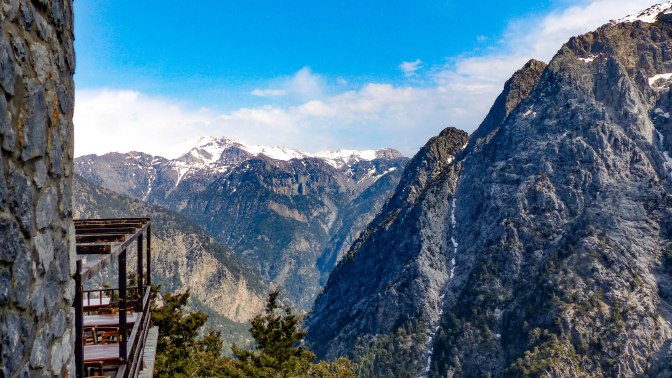 About 10 minutes drive beyond, we arrived at the start of the Gorge itself and parked up. Wow ,what a spot! Dramatic, steep rocky mountains, partly pine forested, plunged down three thousand feet to the gorge floor. There was a lot of trekking signage pointing out hiking routes across the mountains. Very interesting, attractive country. The gorge itself wouldn’t open for another month, being still too dangerous with debris and rock fall from winter. But it looked amazing, that first part of the walk. I wasn’t sure how much I’d enjoy the whole route though , given it’s at low level with steep walls blocking any views. I like being in open country and wondered whether it would be too claustrophobic and ‘the same’ but it did look tempting.