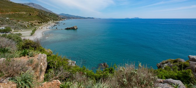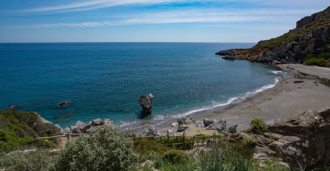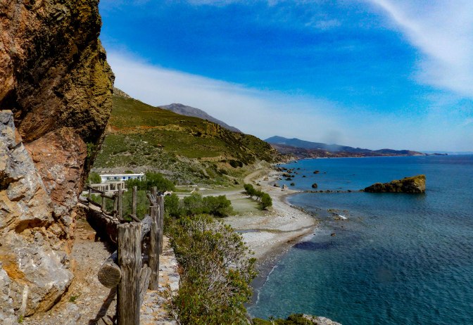 After breakfast on the balcony, we drove back towards Plakias, enjoying those Libyan Sea views again then headed 10km beyond the town to a turn off at an old arched bridge which led to two of Crete’s most celebrated beaches. I love a good beach so was looking forward to seeing them.