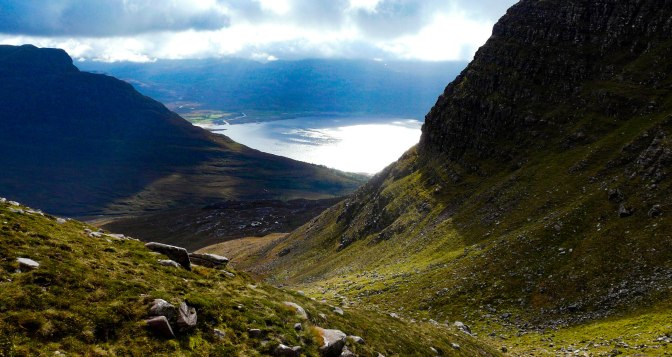 It was a stiff pull up a series of moorland terraces but the ever expanding views behind us across Loch Torridon were a joy to see. The track – initially just a sheep track – did get better as we ascended.Across the loch was Beinn Damh, another superb hill walk possibly an equal to Alligin.
