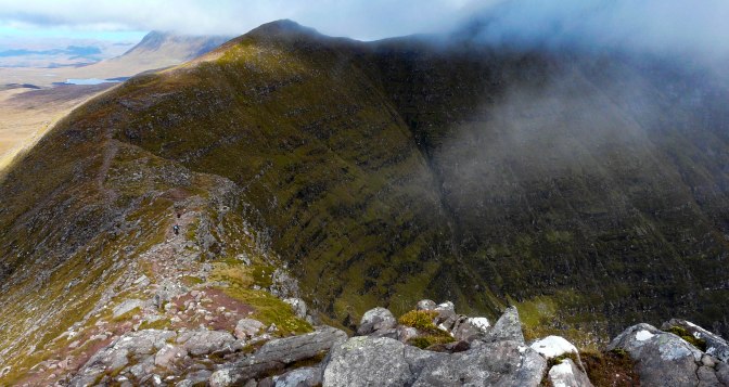 A lovely track now lay ahead and an initially easy walk round a big corrie headwall. This is the point which I find the most spectacular of all – where the Beinn’s big terraces sweep round ahead of you, impossibly steep. The Two Couples were still going at a fair rate of knots ahead but I really like to take my time on a summit. This , after all, is what all the hard work has been about – just savouring being here. The cloud was lifting all the time, though it was also thickening out to the west. Suddenly, a large dark coloured bird soared across the ridge high above us – a golden eagle! Those enormous wings like planks were unmistakable. I don’t think anyone else but us noticed the majestic sight as it cruised across the ridge, lured out to hunt by the clearing cloud. We stopped and watched for half a minute before he (or she) disappeared into the wild country around Liathach. Magnificent. Unfortunately I never got a decent shot; what I took looks like a dust speck in the sky. (In fact, we have often seen a pair of golden eagles when walking up Coire Nobuil itself. Must be their territory.)