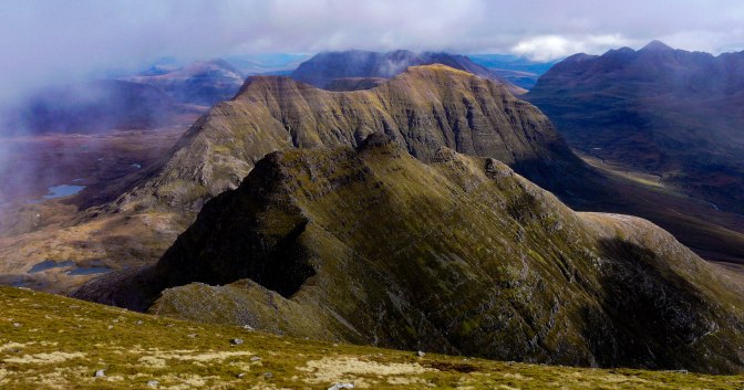 Then lo and behold, the mist began to clear! It was like a curtain opening to reveal the grandest stage of all. Mighty Liathach loomed opposite, a tough hike we’d managed the previous year. Shapely Beinn Damh and layer upon layer of other Wester Ross mountains took shape before our eyes. Fjord – like Loch Torridon looked very blue and very small over 3,000 feet below us. Out towards the ocean, Skye began to materialise through the clearing, ghostly white mist.