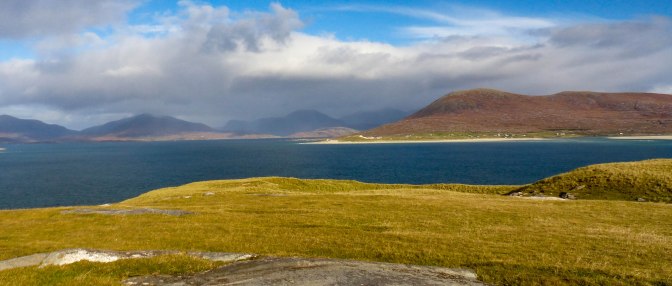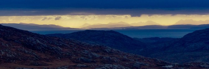 But surprisingly , most alluring of all was the view to the east, across Harris’s rocky wild hinterland and across the Sea of the Hebrides. Etched on the far horizon like sharks fins were Skye’s fearsome Black Cuillin peaks.