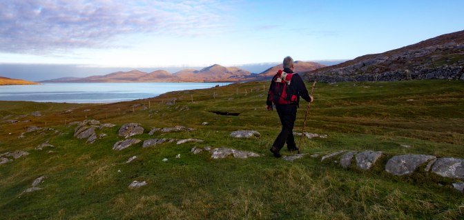 After a good few mugs of tea and some toast, we said goodbye to Gregor who was off to Scarista Golf Course for some gentler exercise. Then off we set at 8.30am enjoying the novelty of not having a longish journey in the car to reach a walk. Instead, it was a five minute stroll down the single track road to where we spied a gate that looked a promising way to get across the heavily fenced croft land hereabouts; this is sheep country. The ‘official’ start for the whole ridge walk is actually miles back on the Luskentyre road but we were only doing and ‘up to the highest point and back’ walk today.