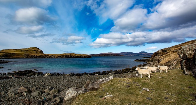 It’s was a flattish stroll of 2.5km (1.5 miles) to the tidal causeway across the dry short cropped grass of a crofter’s field , where sheep grazed quietly. What a glorious outlook, even from here, with the Black Cuillin smothered in white across the silvery grey sea loch! It had been a hard cold winter and Skye’s peaks were still snow covered.