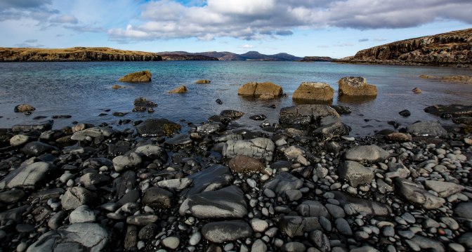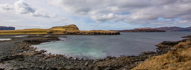 We picked our way across the dark shore of small boulders and pebbles.There are few white sand beaches on Skye – it is too volcanic an island and the shore tends to be quite rough and rocky.