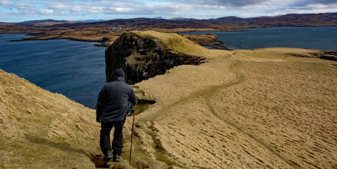 Then a short uphill track which took us to the top of the island, above precipitous cliffs where sheep grazed on impossibly sheer edges and ledges.The wind had whipped up a bit so we kept well back, admiring the wonderful vistas all around us.Even the familiar pyramidal top of The Storr on the Trotternish ridge was now visible, snow dusted.And there were Macleod’s Tables, those distinctive flat topped mountains overlooking Loch Dunvegan and the scene of yesterday’s excellent (if much tougher!) walk.