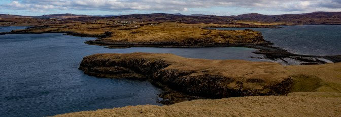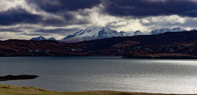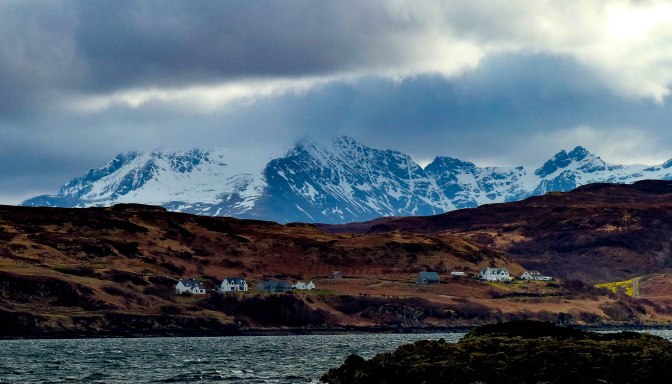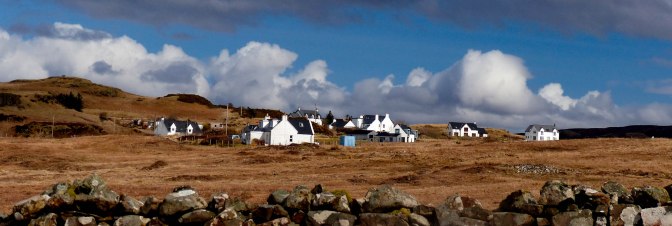there, fleeting shadows across the crofts of Fiscavaig before the cloud cleared and the whitewashed houses seemed as bright as lights against the dark moorland. Fiscavaig is a small township originally settled in the 19th century by crofters and fisherfolk from Harris.What views they have across the sea from that quiet corner of the Isle of Mist!