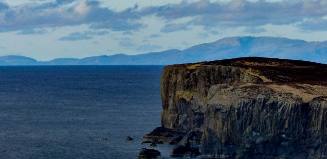 Beyond Wiay island , the big headland of Idrigill reached out a long rugged arm into the dark blue of Bracadale’s deep waters and the open ocean. The slightly unnerving, almost giant sized human figure at the end of Idrigill is one of Macleod’s Maidens – The Mother – a 70m high sea stack. It had a Lord of the Rings look about it from here, a giantess emerging out of the sea.