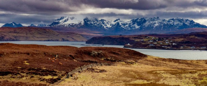 To the south, our view was of the serrated peaks of the Black Cuillin mountain range, wreathed partially in cloud.
