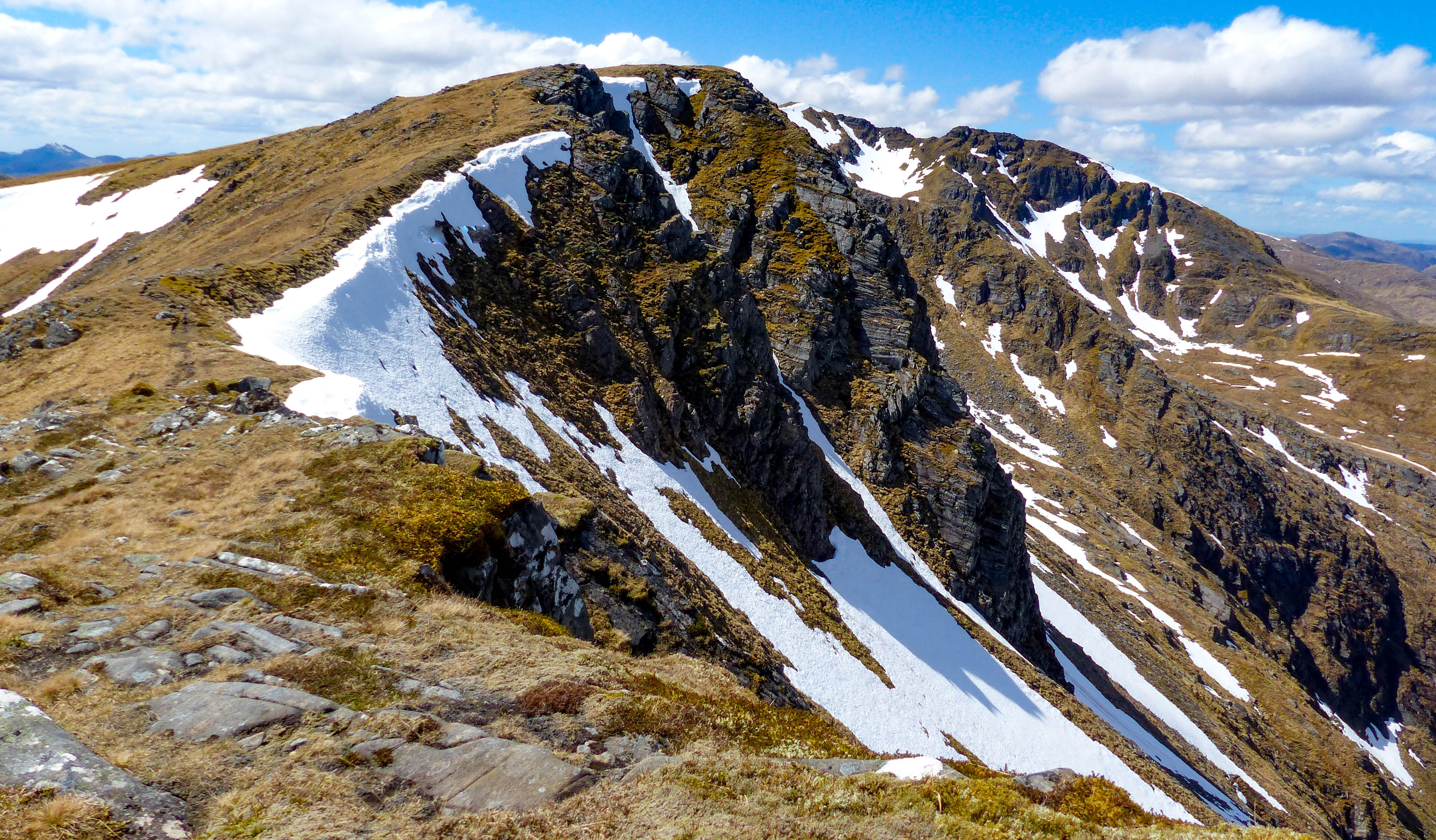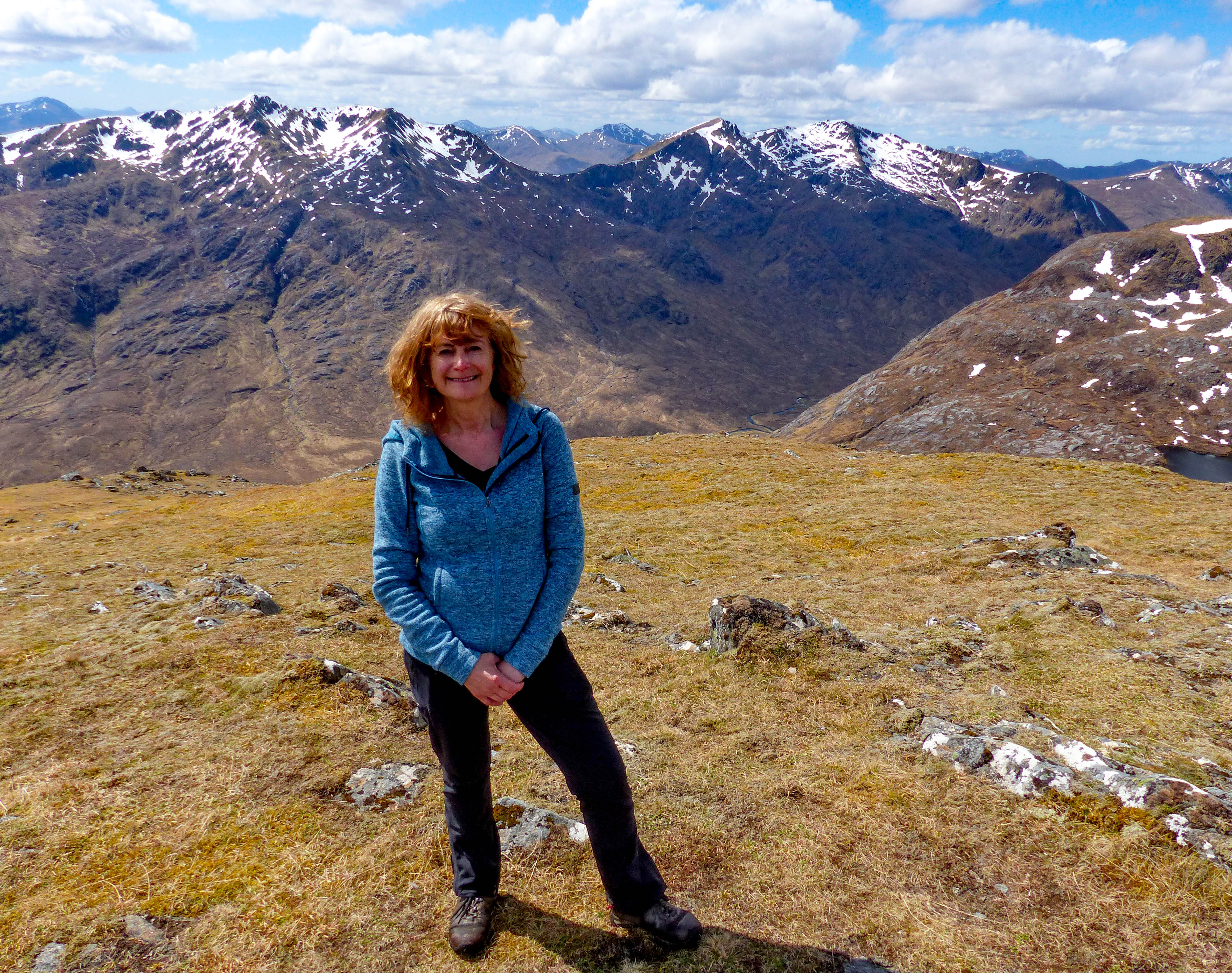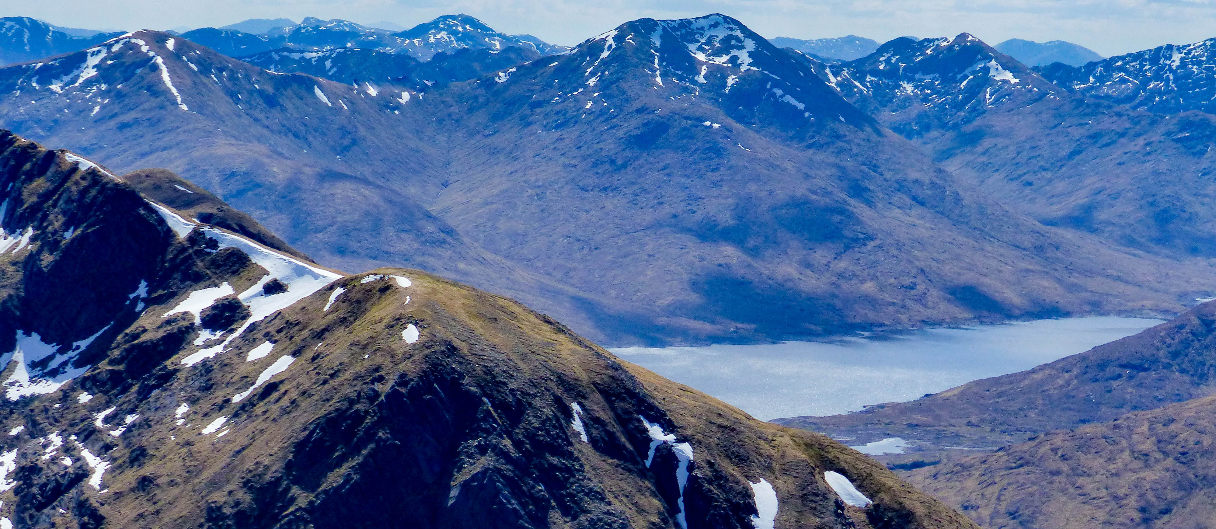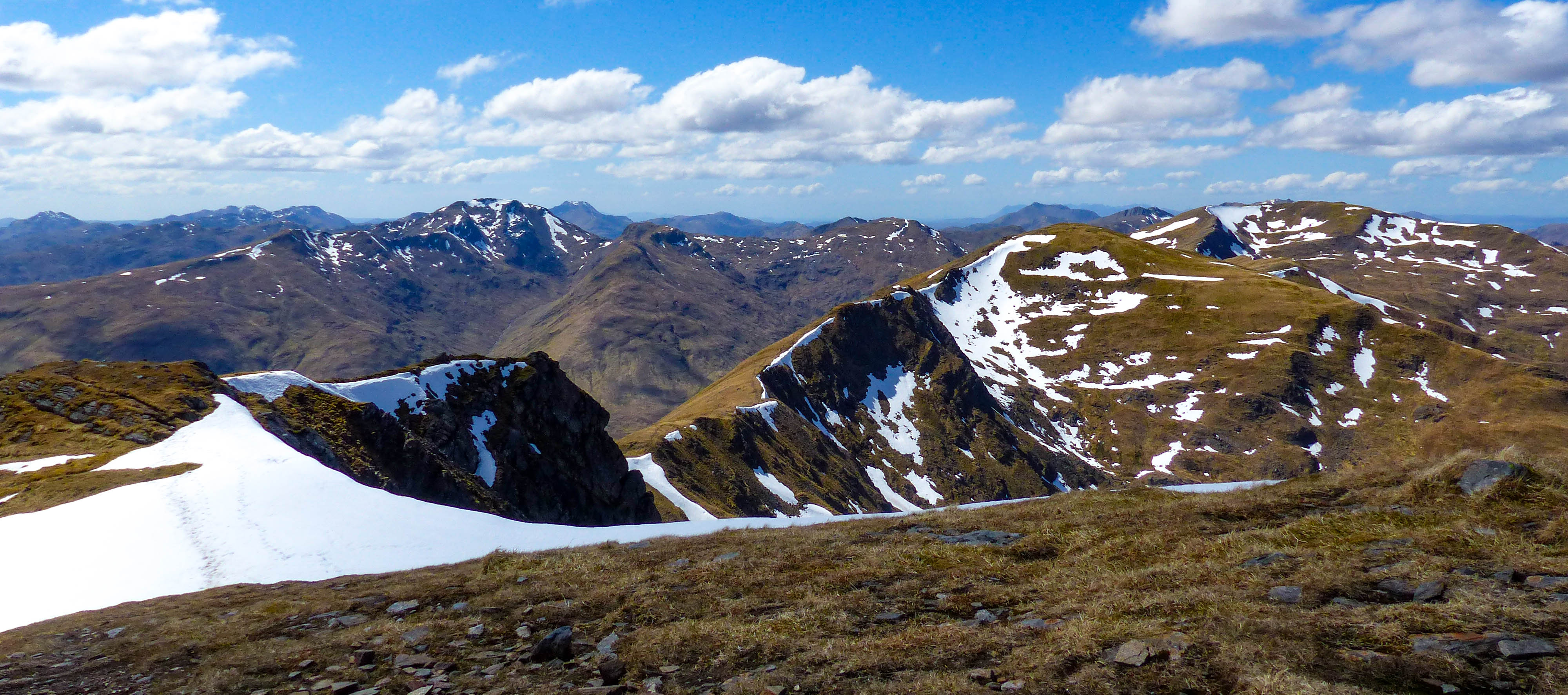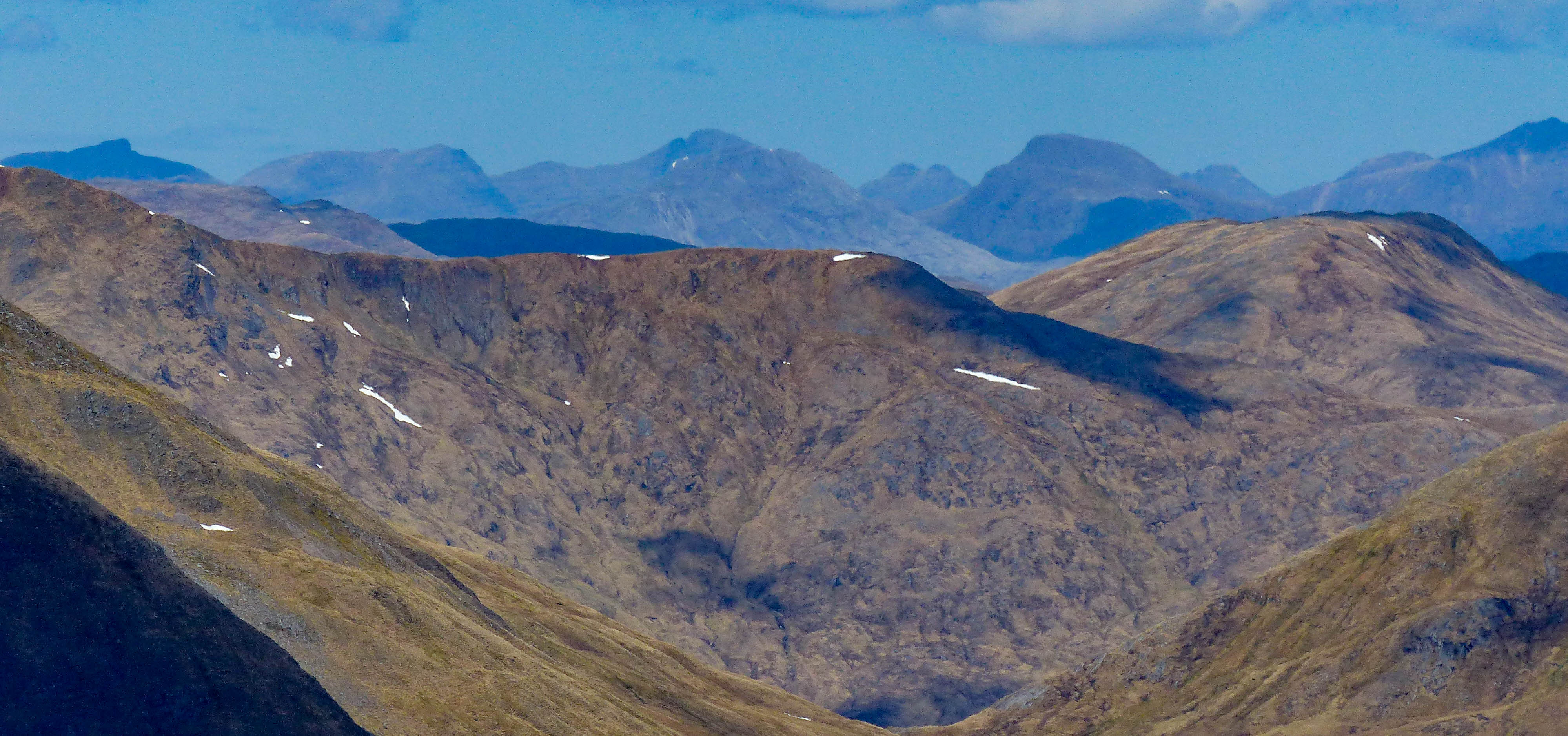 We had a stop at the summit for water and fruit and a big ‘well done’ from Chris. The scene around us really was superlative.Directly across lay the Five Sisters Ridge, a beauty of a walk I’d done many years ago. In the far distance, the Torridon range and the mountains of the remote Coulin Forest were visible.