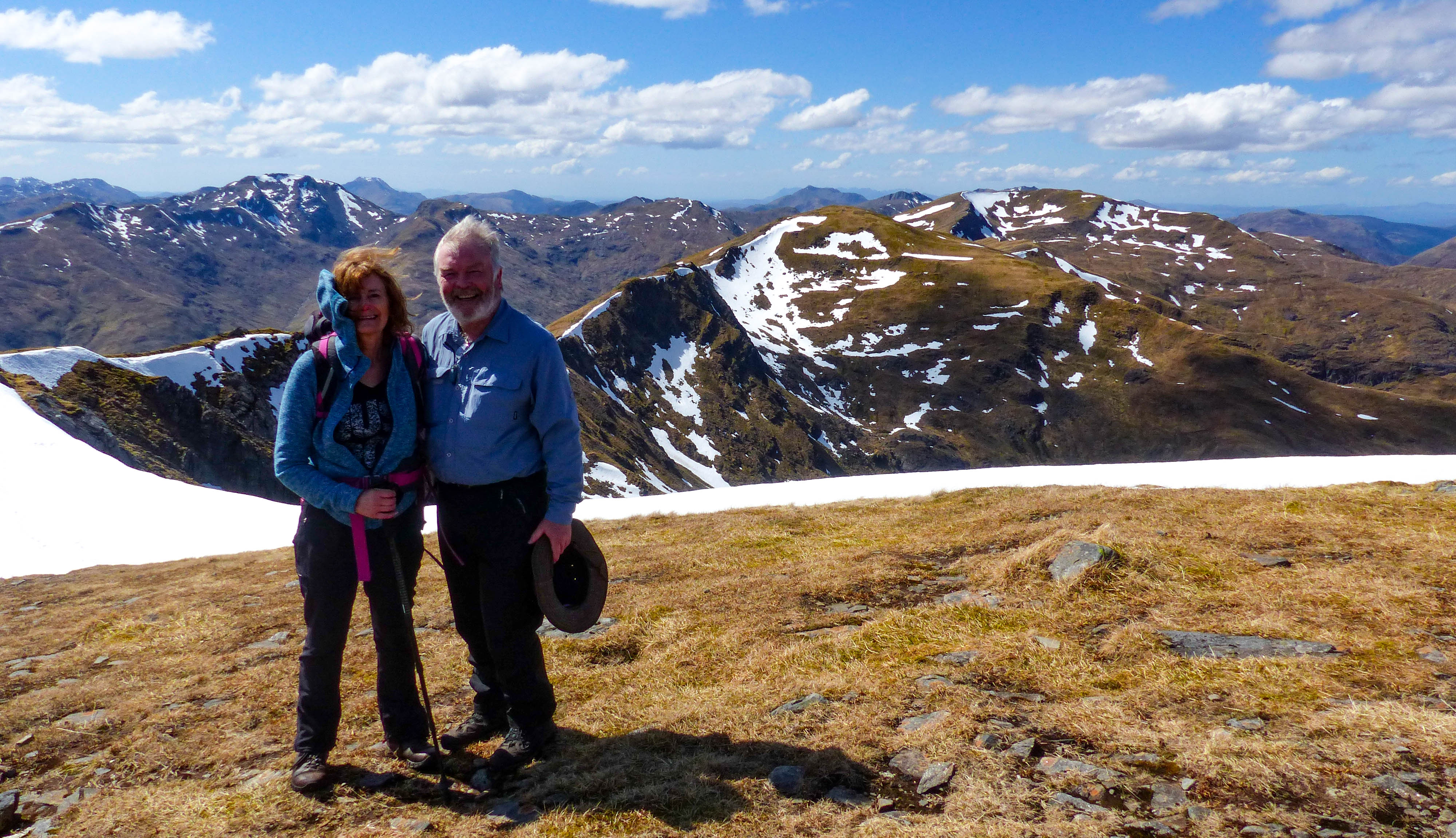 2 hours 45 mins after leaving the car, we reached the wide, spacious grassy summit of out first Munro. Always a great feeling of achievement to bag one! Exchanged hellos with a couple of guys we’d spied above us for most of the route and who were now demolishing their lunch.At this elevated height, the temperature was perfect – coolish, light breeze, warm sun.We’d spent the previous night at an excellent B&B – Mo Dachaidh – which means My Home – on the spectacular Carr Brae road above Loch Duich and had stuffed ourselves full with muesli, yoghurt, full cooked breakfast – sausage, egg, bacon, beans, mushrooms – and mountains of toast, so weren’t hugely hungry.Water was the thing now, plus chocolate for me.To this point we’d now walked 7.5km with 730m of ascent.