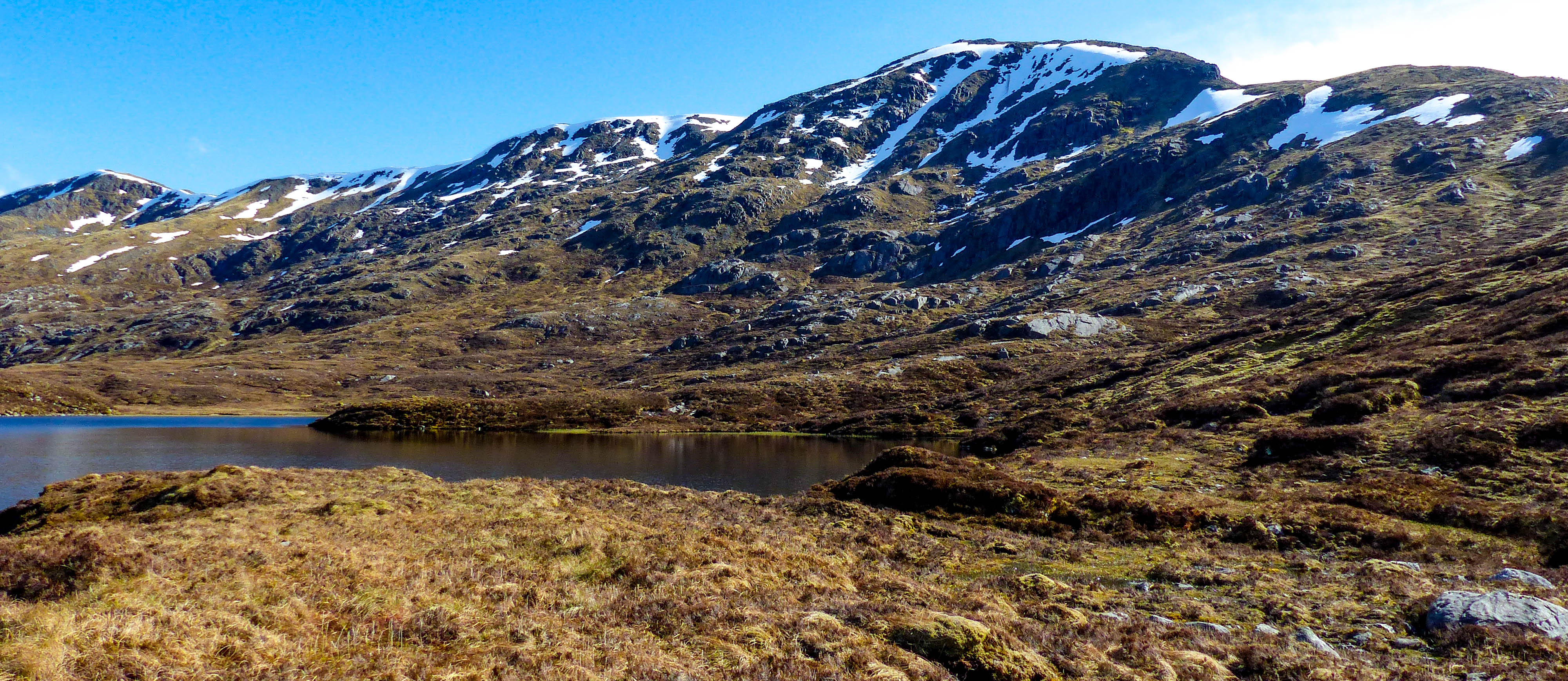 We set off from the car park behind the Cluanie Inn at 10am, the mountains looking magnificent.They hadn’t greened up yet as it was only May so everything high was dun- coloured , golden and purply- brown. Against the blue of the sky and the lochs, to me, it is still stunning.