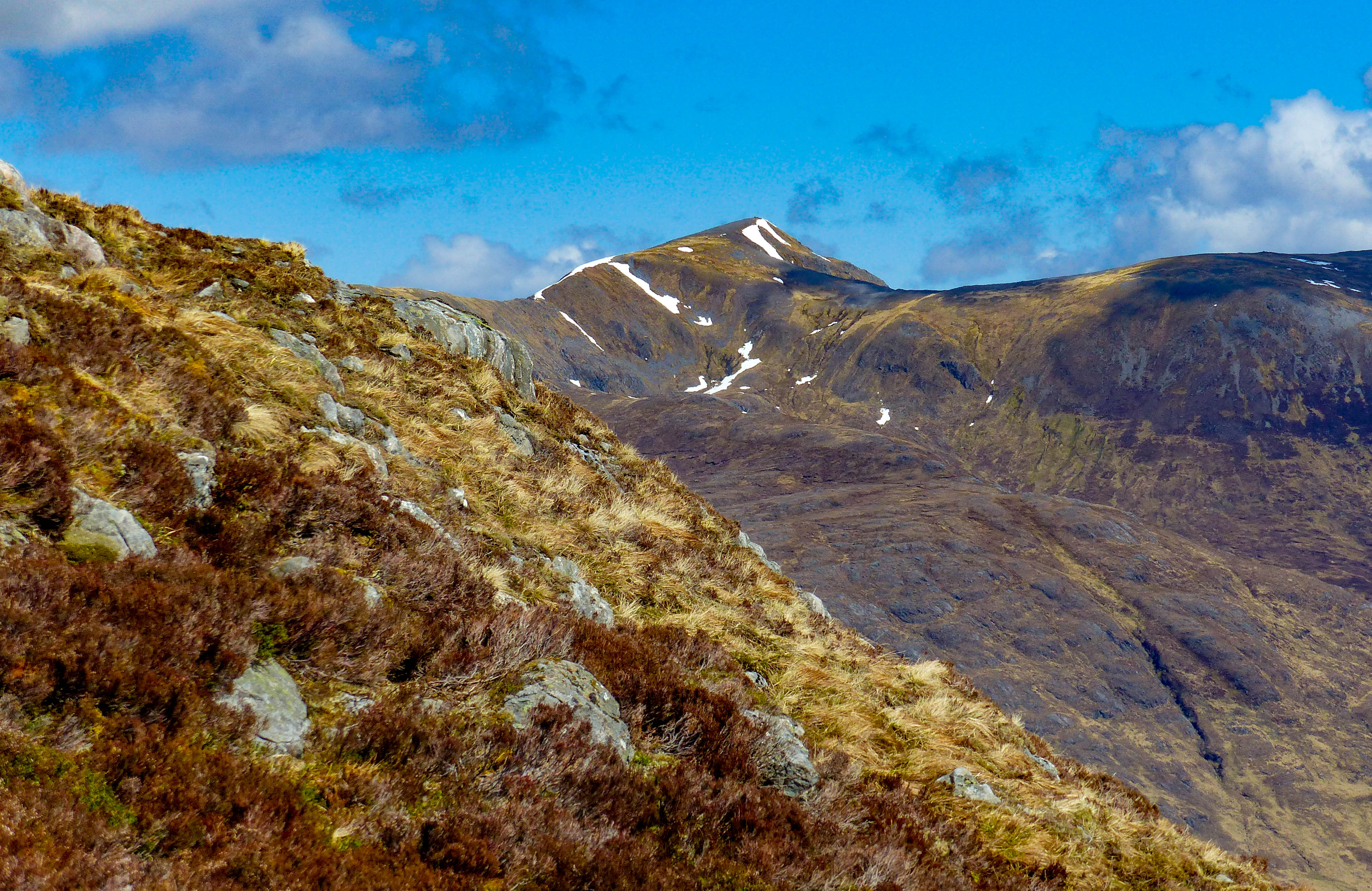 Creag a Mhaim itself looked rocky and steep and I felt a vague sense of foreboding looking up at its crags. However, the stalkers path did indeed circumvent these perfectly, making me feel much happier. The views over to Gleouraich and the mountains of Knoydart drew the eye constantly.