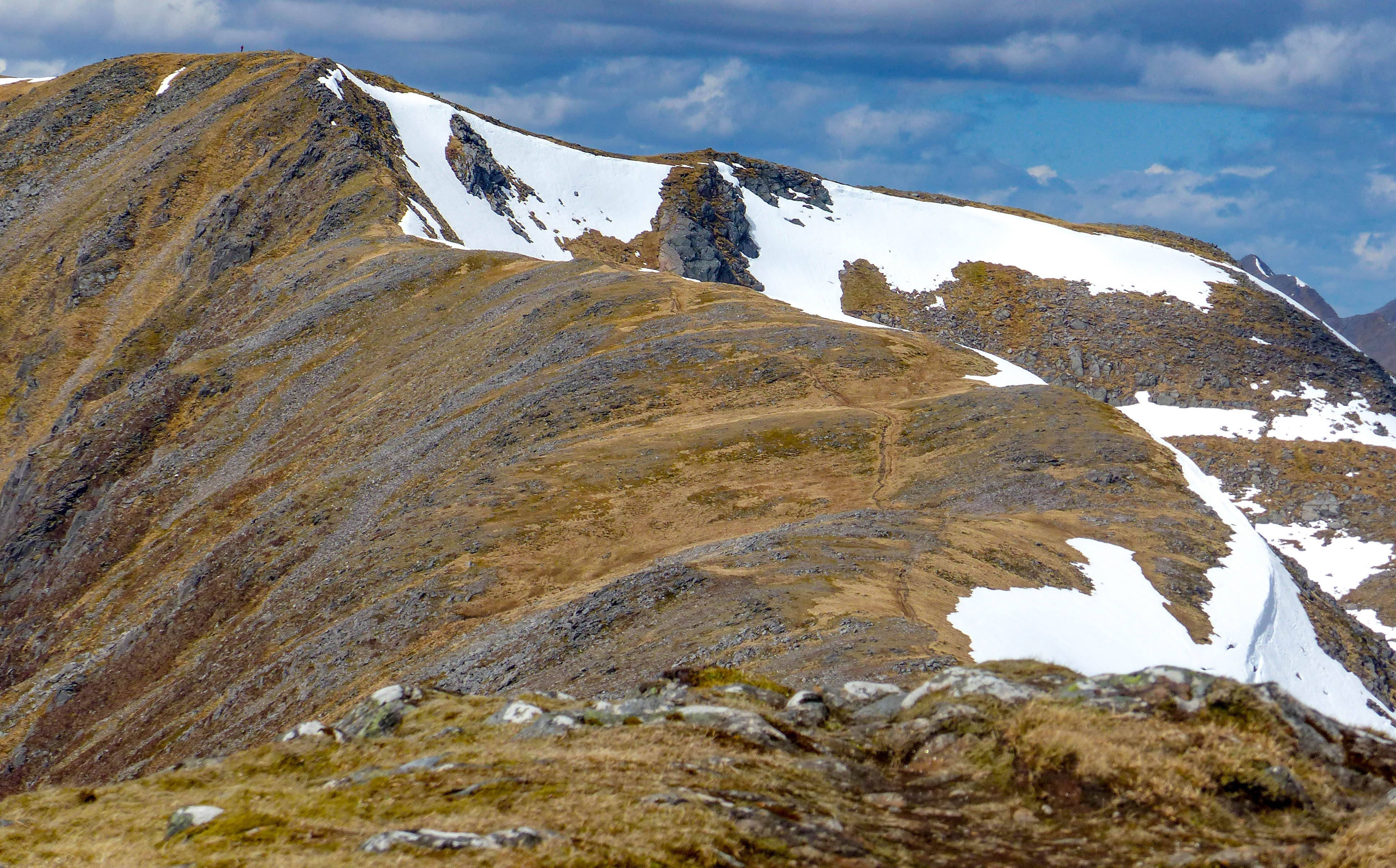 We decided to keep going on towards the 3rd summit and Munro of Aonach Air Chrith, the highest on the ridge.Looking ahead, it was all lovely easy ground and I felt much happier.We only passed one other couple – the woman , grim faced , walking far ahead of her partner.Neither of them returned our nods and hellos which is unusual on the hill because people are always very friendly and keen to stop and chat for a bit. But I think I recognised the look on her face; I suspect she’d been encouraged up here with an ‘it’s easy peasy’ but it hadn’t worked out quite as easy peasy as expected.Chris has on a few occasions lulled me into a false sense of security with mountains he’s climbed years ago, only to see me baulk at a section or three, which he then suddenly recalled as being ‘a bit nasty’ resulting in An Argument or at the very least, Silent Tension.I may of course have got this totally wrong!