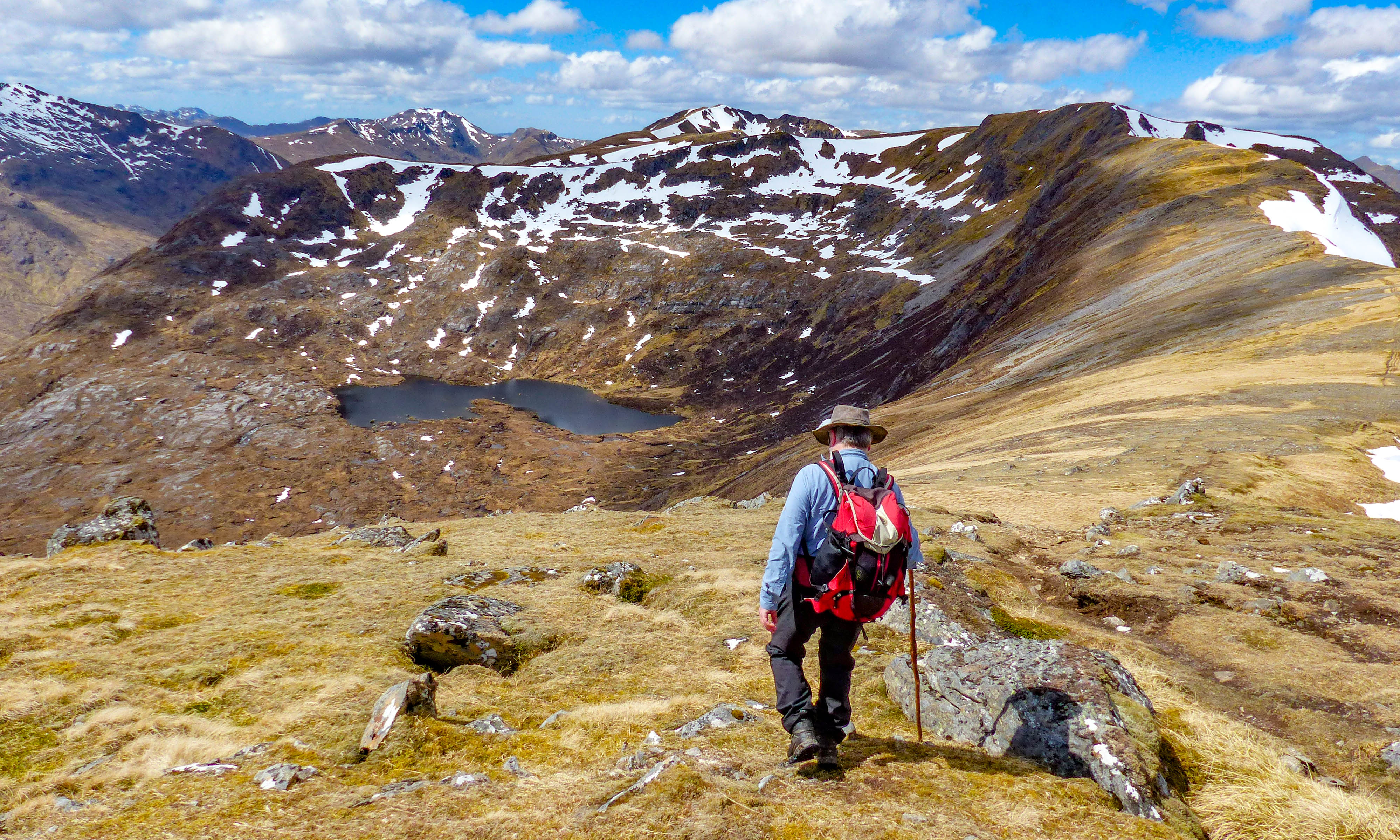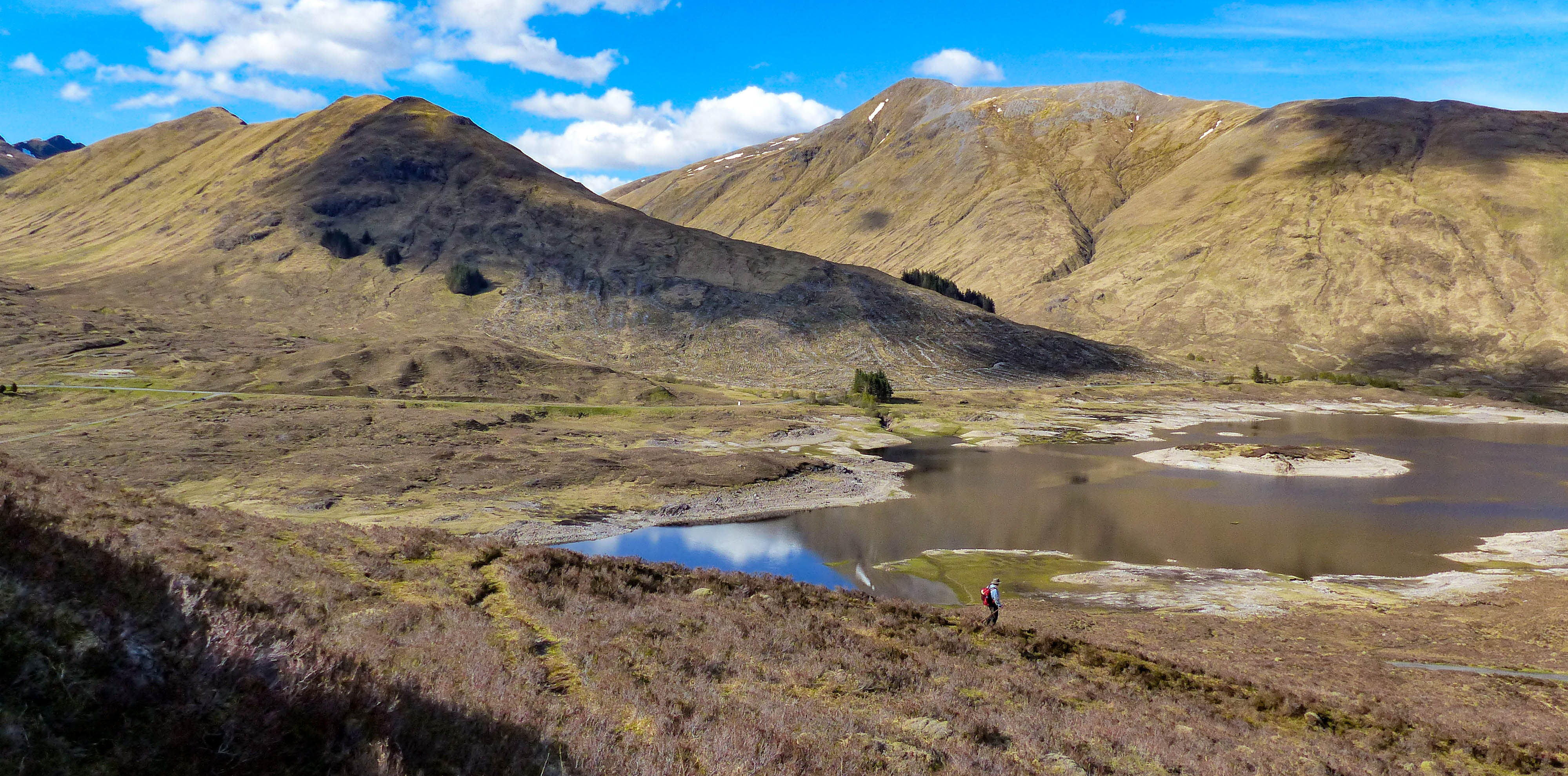 I couldn’t do the first bit it standing up however but shuffled down the scree and boulders on my backside, stones flying down in front of me as I dislodged them. I took so long do this that before I reached the bottom, I noticed that Chris had popped open a beer and was enjoying a relax on a big boulder! At least ahead of us, it was all now easy ground and we were soon passing a beautiful high lochan part way down.