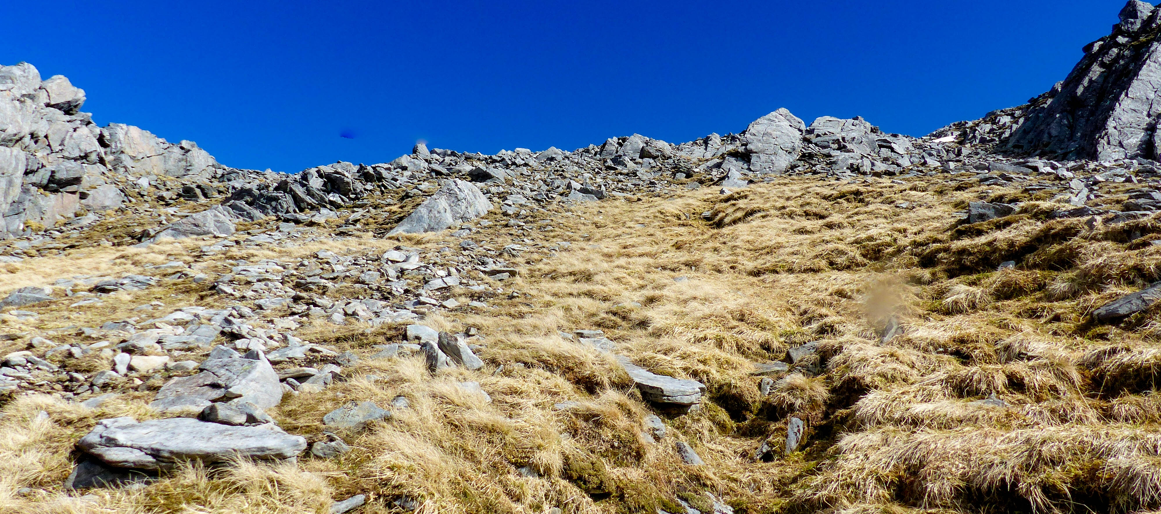 We knew that the descent from this summit involved a bit of a rocky scramble which the book said was so steep that many people shuffled down part of it on their backsides.