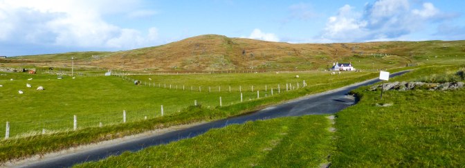 Past a small lochan, on we went for a few minutes more to the very end of the public road where we knew there would be access onto Beinn Shleibh, Berneray’s tiny highest point at less than 100m. No parking at Sandhill Farm itself, so we retraced our route a few hundred metres until we saw tyre tracks leading onto a flat grassy area behind the east beach.