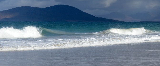 On a sunny day, the glacial green/turquoise of the shallow Sound of Harris was mesmerising, with the dark blue mountains of Harris itself rising in shapely forms on the northern horizon. Emerald green Pabbay, uninhabited but used for sheep grazing in summer, lay to the west and we could just – just- make out the familiar outline of St Kilda 45 miles west on the far horizon. North Uist’s low hills and white sand beaches were in rain shadow to the south. Skye’s impressive cliff headlands and the unmistakable shape of the Cuillin ridge, reared out of the ocean to the east.