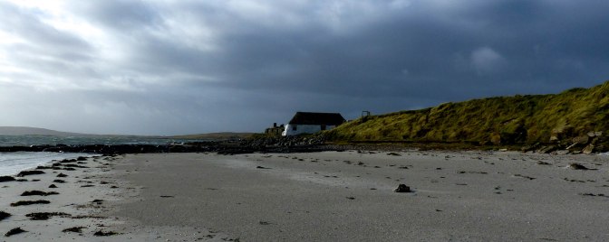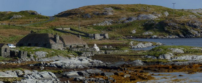 I often think Scotland must be one of the most colourful countries in the world, especially in autumn and winter and under scudding clouds. Thankfully, the worst of the showers had moved well to the east, missing us completely. We made our way close to the surf line, dodging the waves occasionally and delighted at the sunny weather. It’s a case of picking the best spot for leaving the beach and finding one of many grass tracks which lead across the machair and back to the public road again.Many Blockhouses are now being converted into holiday properties, blending in to the rocky landscape by the shore.