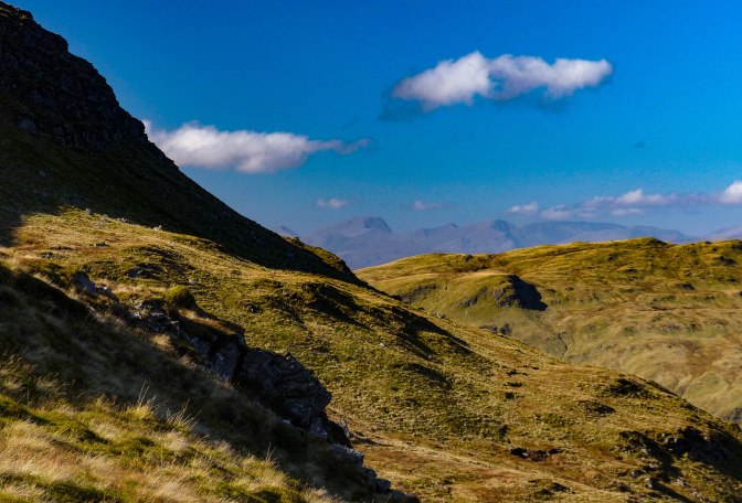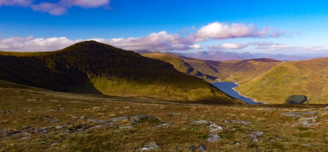 We parked at the end of Glen Lyon’s single track road at Loch na Daimh (loch of the stag) where a reservoir has been created.It’s big lonely country here , stunningly beautiful.A good track took us up towards the hill for the first 15 minutes but we were on the look-out for a boggy path which headed up the mountain. Sure enough we found it and began the slog up the wettish slopes and onto the ridge itself. The going was a lot easier now though we still had some small ascents before Lochan na Cat came into view far below us. Already, it was difficult to keep walking for long without stopping to stare at the vistas around us. The light was wonderful, as it often is in autumn. One of those days when I feel so lucky to have found hillwalking and to enjoy that connection with a wild place that seems to make the spirit soar.