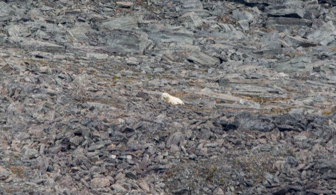 It was an exciting day already and more was in store later that morning, when a mother bear and cub were spotted on shore.They were a LONG way off , resting high above the small bay we were due to land on.We watched them for a while before it was decided to launch the zodiacs and head for a bay on the opposite side of the fjord, it being too dangerous to risk a landing below them.Also, the guides can incur hefty fines if any activities disturb a bear’s behaviour. I was a bit frustrated by this as I thought it would be far more interesting to wait to see if the bears ambled off anywhere. My plan (without any nautical knowledge at all of course) was that the ship might be able to follow them by sailing round the other side of the narrow promontory, so that we might get a close up view.No-one read my mind about this cunning plan and instead we headed for a fairly dismal, rubbly shore enlivened by a brief sighting of a bearded seal, some skuas and arctic terns.But compared to polar bears….
