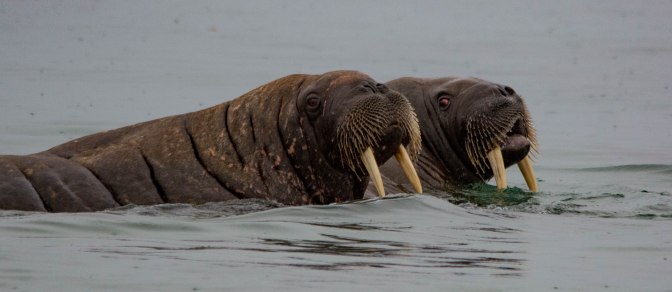 They were very playful with each other and looked to be thoroughly enjoying themselves. Then one would turn its huge red/brown eye our way, sniffing the air before slapping its companion. What great fun they were! However, meeting them in a zodiac can be fatal – in the water, the boats are seen as a threat and may be attacked. With their long tusks, they have been known to puncture a RIB in a nano second(and no doubt a rib too.)