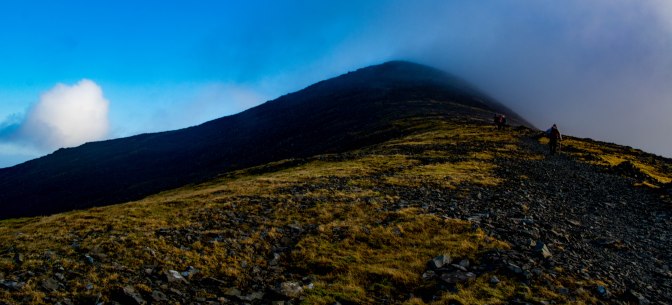 There are multiple points to cross the river/burn, none difficult but we now very quickly were on a very wet section.Thank goodness for good boots! This fairly quickly became a bit rockier as the track climbed more steeply, but it was always easy, winding its way up the moorland. Ahead, slightly worryingly, mist was wreathing the summit and my heart sank; not another forecast that was wrong, surely? The cloud was supposed to have lifted by now. I silently cursed our Mountain Weather Information Service, which is mostly a boon but also depressingly TOO often, the bane of many a hill walkers life, luring us out onto the mountains with the promise of clear summits only to find they are heavily wrapped in low cloud and mist – The Clag as it is known.