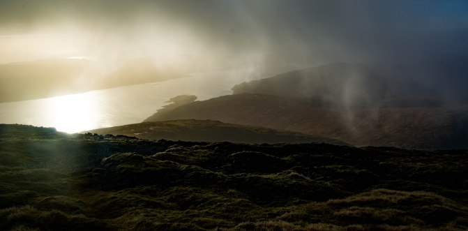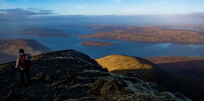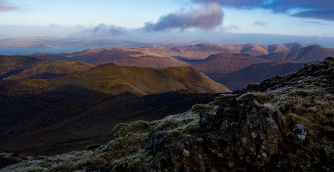 It had taken us 2hrs 15 to the summit (10.15am – 12.30pm) , including several little stops and a lot of photo taking on the ridge itself. It was a good 45 minutes later at 1.25pm before we began to make a move to descend. Incredibly, there was no wind at the summit. This frequently happens! The little cluster of other walkers that we’d said Happy New Year to, didn’t hang around long so we soon had the place to ourselves. Spicy chicken sandwiches and boiling hot Minestrone soup from the flask never tasted so good! But leave we eventually had to as it would not be a good idea to drive that road back to the cottage in the dark. Too high a chance of colliding with red deer or sheep. Getting the journey over while it was still daylight was now the priority, as well as enjoying the blue sea loch below us, the islands and the winter sun on the now golden moorland.
