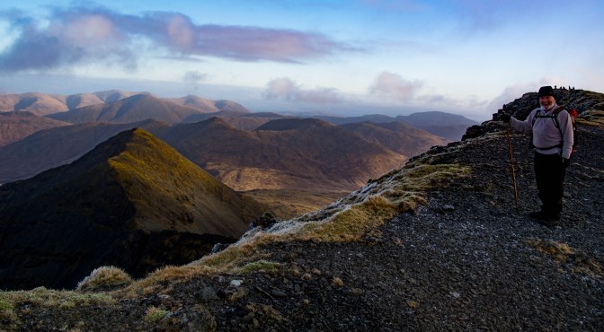 Then suddenly the angle eased and we were on the flatter summit ridge. Wow – the dramatic cone of A’Cioch reared to the side, a much more difficult ascent route and it looked terrific.