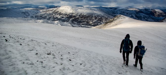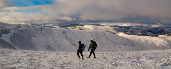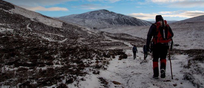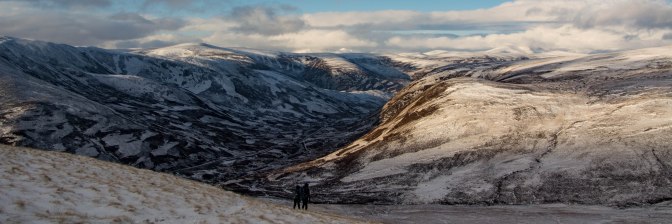 But in deepest darkest January, the white dusting of this so-far mild winter’s first snow had me shivering in the car park above Glen Clunie as I donned gaiters and decided whether to walk in my mega cosy Duvet jacket or not.In half an hour I would of course be boiling hot, sweltering with the effort of ascent.But I am so averse to feeling chilly that I can never stand the thought of walking cold – initially – with thinner layers. Wimp that I am , the Duvet jacket won.So Nanook of the North set off behind my younger son Gregor and his fiancee Lucy and my husband Chris, with the treacherous thought – ‘I hate walking in snow!’