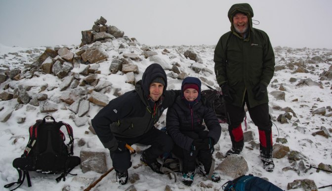 Wow it was cold up here! Not much shelter behind the cairn but we all managed to scoff a sugary snack or two and enjoy our first Munro.Well, what little we could see of it anyway! The forecast had promised an hour or two of hefty snow showers and cloud and it looked like they’d settled in nicely already.