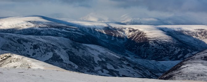 To our right were the 3 Glenshee Munros we’d explored in November, when the four of us enjoyed a fine day out on The Cairnwell, Carn Aosda and Carn a’ Gheoidh. All of this area forms the Southern Cairngorms, within the National Park.
