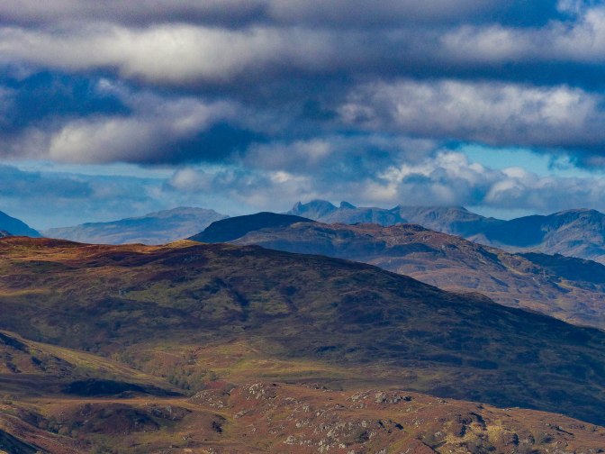 The blue of Loch Katrine below, led the eye to the more distant , higher mountains of Loch Lomond, all in a palette of gold, tawny and amber.The ancient oak and birch woodlands that line the loch were still mostly inmate summer greens. Through the zoom lens, the air clarity allowed some good close ups of the rugged Arrochar Alps, as they are called.
