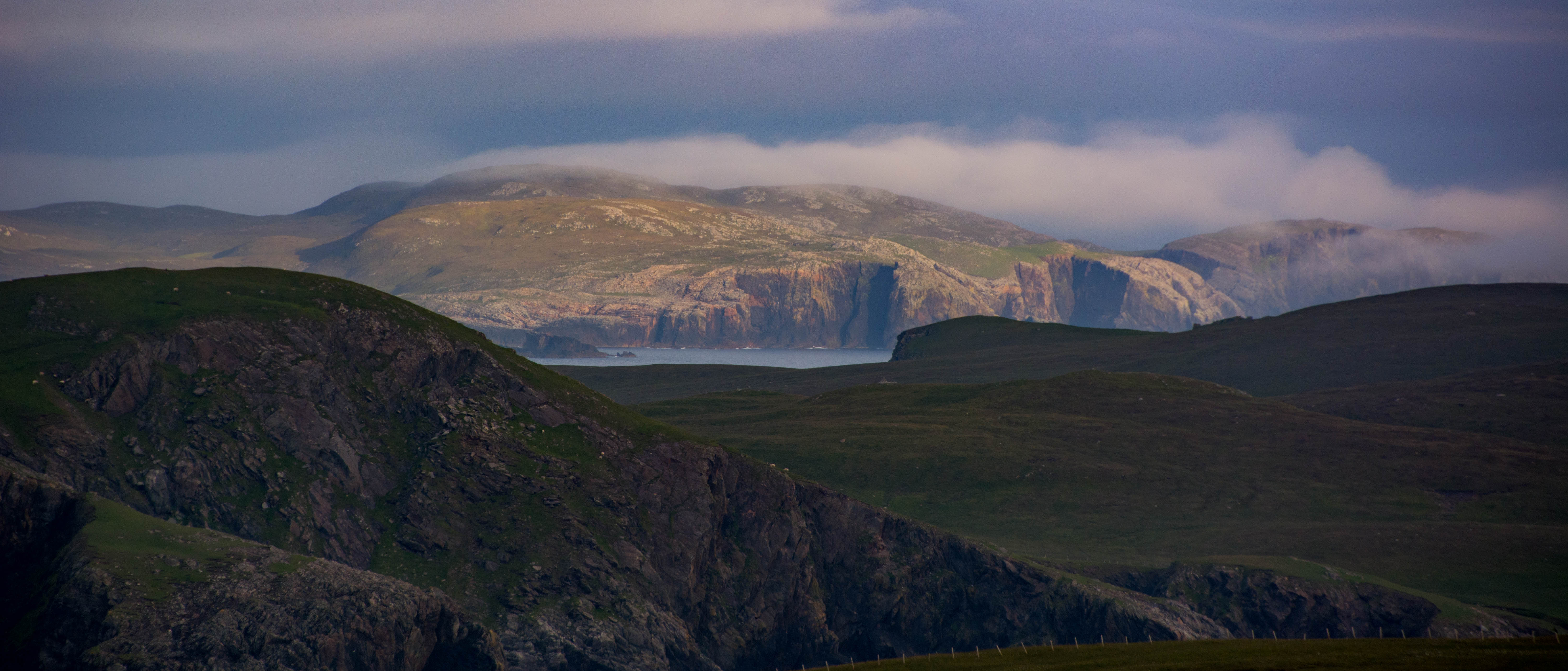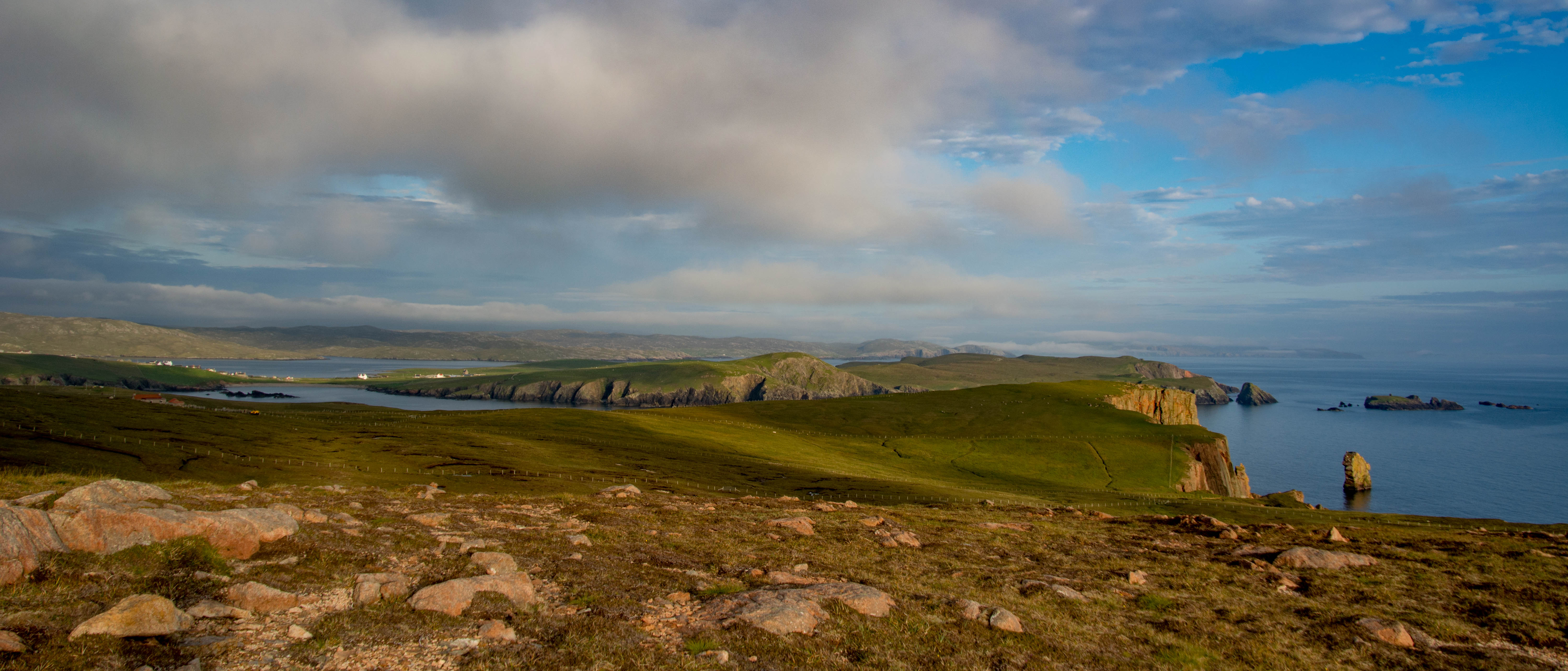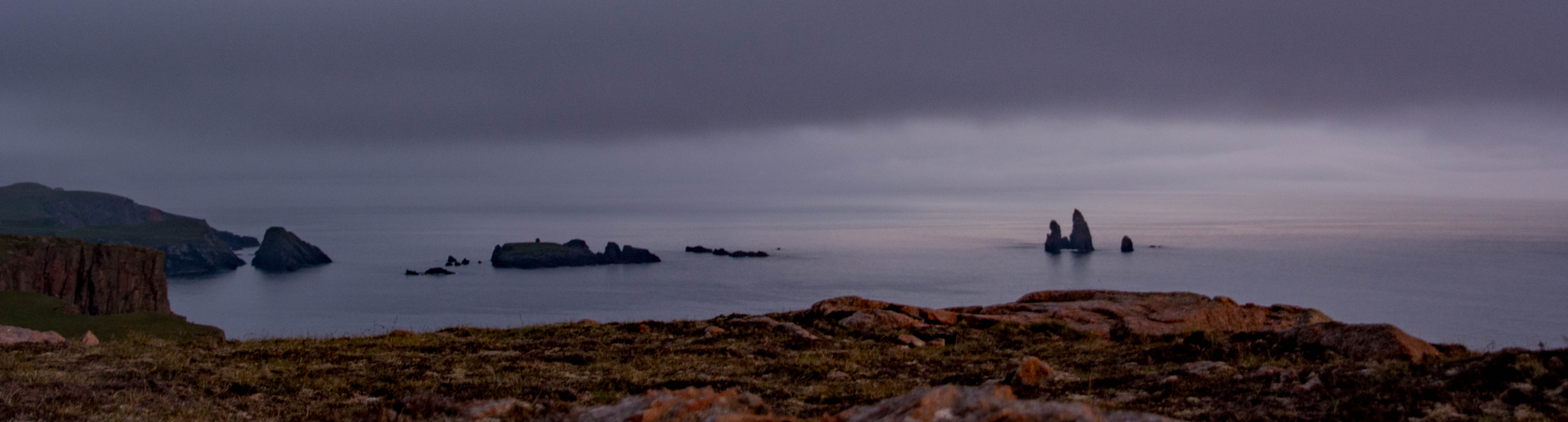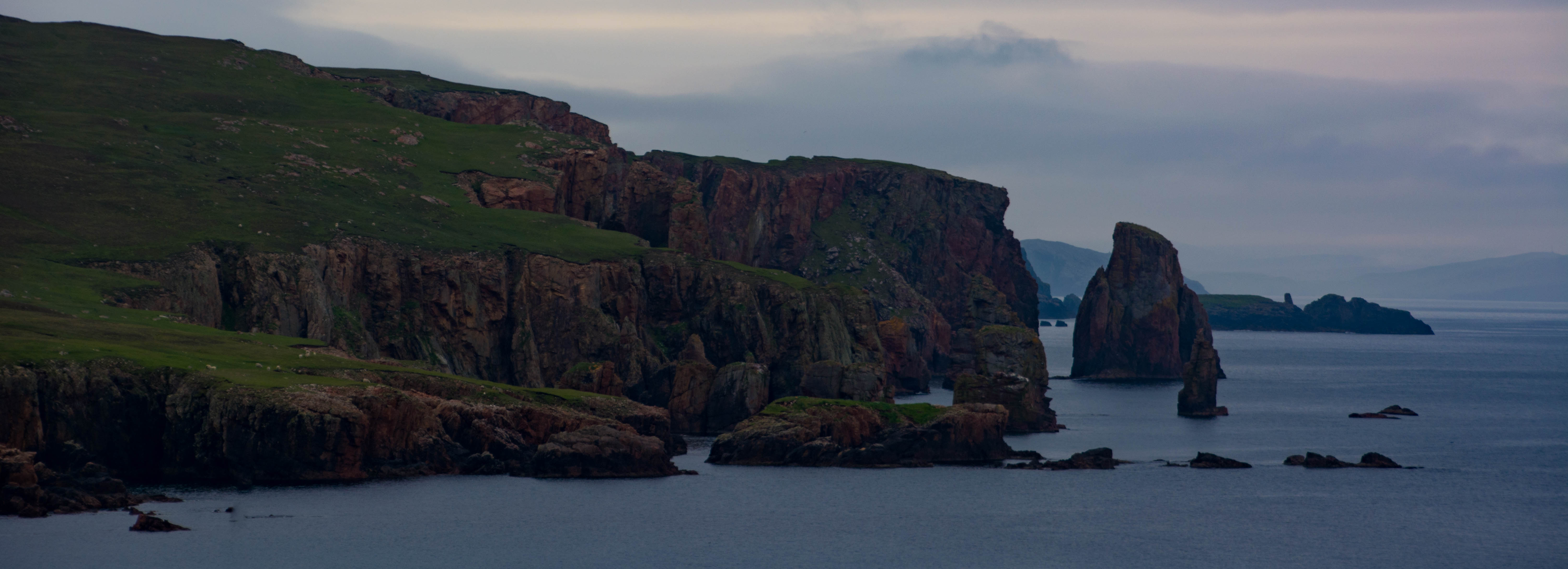 It was a beautiful and fast drive towards Hillswick on West Mainland, an area close to tomorrow’s plan of attack – the cliffs of Eshaness. Encouragingly, the skies were now clearing the further west I got. The cliffy coast in the evening light looked superb and I had to stop and get out of the car and just stare several times. Layer upon receding layer of headlands and offshore rock stacks, a fractured coastline washed by the cold North Atlantic.
