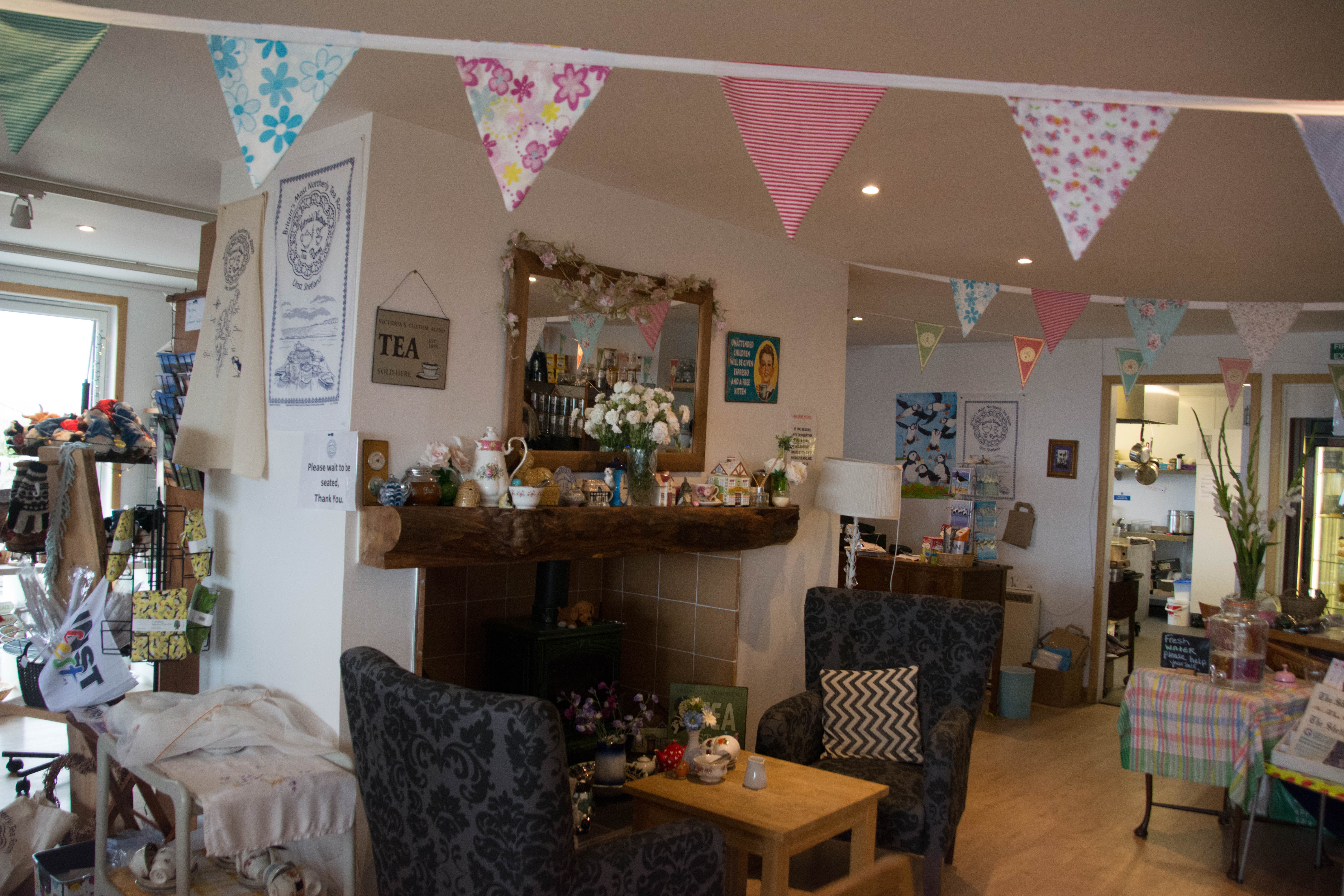 Tiny Haroldswick – named after the Viking Harald the Fairhair – was a 20 min or so drive away, in another attractive looking area of Unst. I made a bee-line for Victoria’s Vintage Tearoom, probably better again than Lerwick’s Fjara Cafe.Gorgeous inside, all a tearoom should be, with food served on old china.Very busy too at 3pm. Nice wee shop with soaps and I bought two Lodberry Shower Gel bottles to take back; another weakness, great smelling soap! I took my warmed fruit scone and tea out on the terrace, just in case the Orcas made an appearance again.