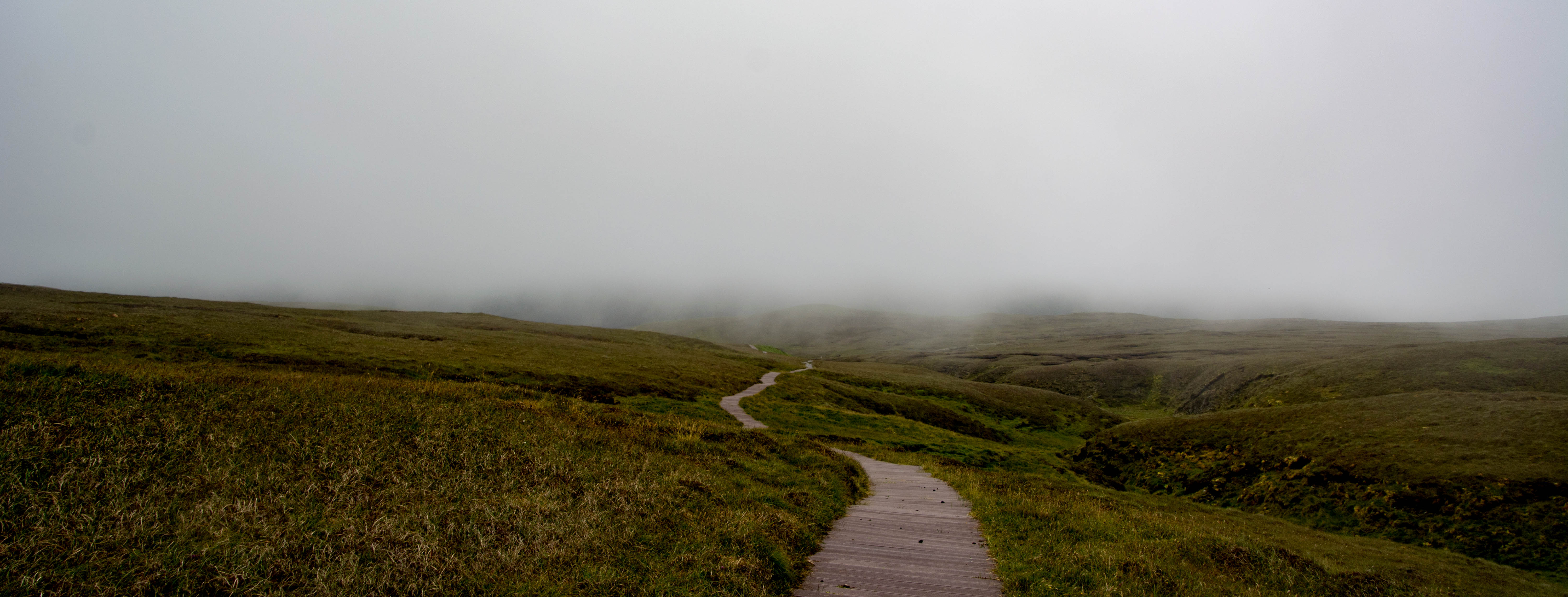 The fog stayed well down as I crossed the sweet smelling moorland and at times I could barely see 20m ahead. It just wasn’t lifting at all and it blanketed everything in silence – very spooky.In about 35-40 mins, the boardwalk suddenly ended and I knew I was in the vicinity of the bird cliffs.But they were cloaked in mist.In fact where the ground ended over the drop was difficult to make out and I kept well back.I’m always a bit unnerved by cliff edges anyway, more so when I can’t quite make them out!