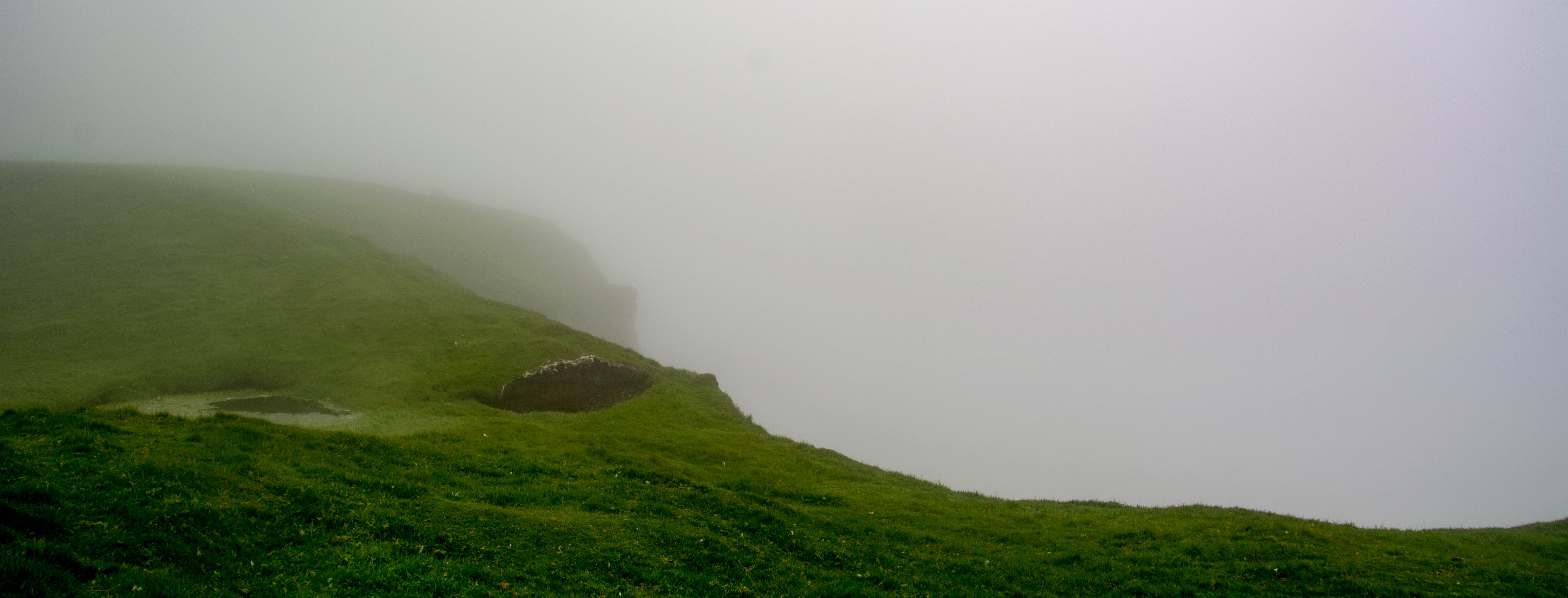 Two cute wee puffins stood outside a burrow, a lovely sight; below them, the fog swirled , thinned tantalisingly, then thickened again. A couple of people loomed out of the mist and we commiserated about the conditions.What the heck , it was windless and mild so I took off towards the highest section of cliffs where 100,000 + gannets, fulmars, kittiwakes and guillemots make up one of Britain’s most important seabird colonies.I was enjoying the walk and it was on soft, short cropped crass now, nice and dry.