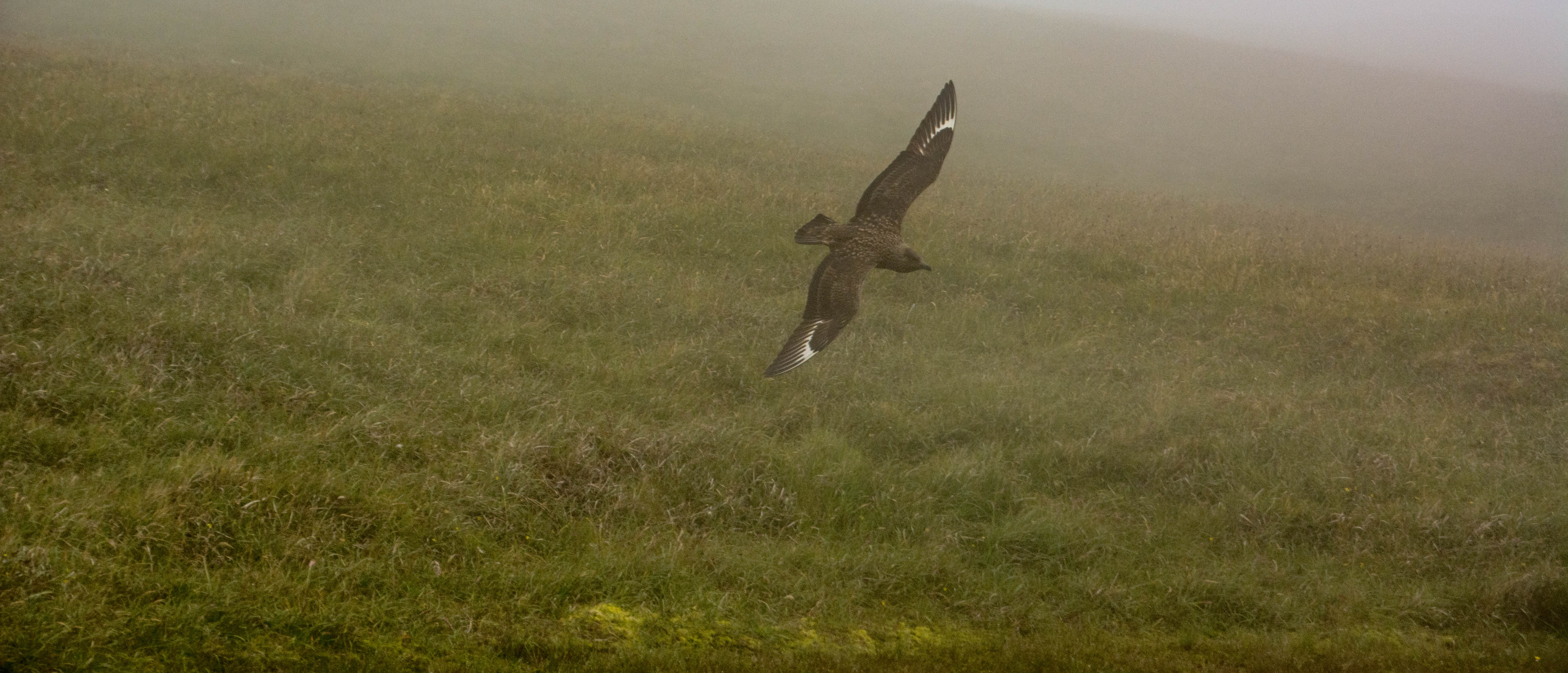 They headed off and I hung around, more confident now of the ground.But if anything the fog was becoming even more dense rather than clearing and eventually staring into nothing at all seemed a bit pointless so I headed back. I loved the silence and sweet scent of the moorland section, so decided to stop for half hour and have my lunch.Sitting just off the boardwalk on a stone, I watched the skuas flying past me, coming closer and closer as they got used to my figure in the landscape. It was quite magical in an ethereal sort of way; they were curious, checking me out with their brown intelligent eyes but not in their usual intimidating way.They were very vocal, chattering in very distinctive, low harsh tones to each other, the only sound in an otherwise silent world.