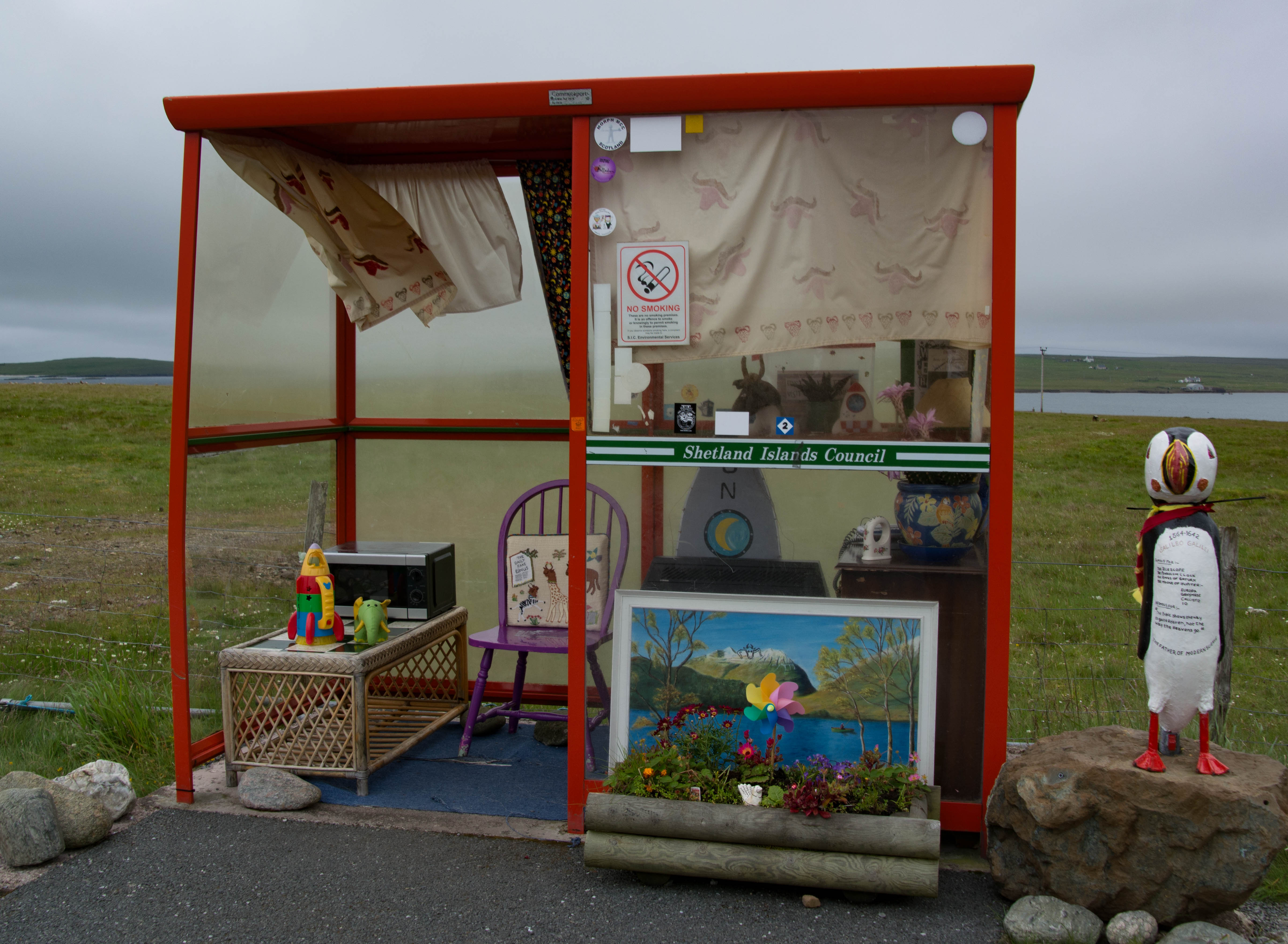 Finally, 5 mins drive away , lay Unst’s bus-stop, perhaps the world’s most famous.Just outside Baltasound, it is decorated in a different theme every year though who decorates it is a mystery.
