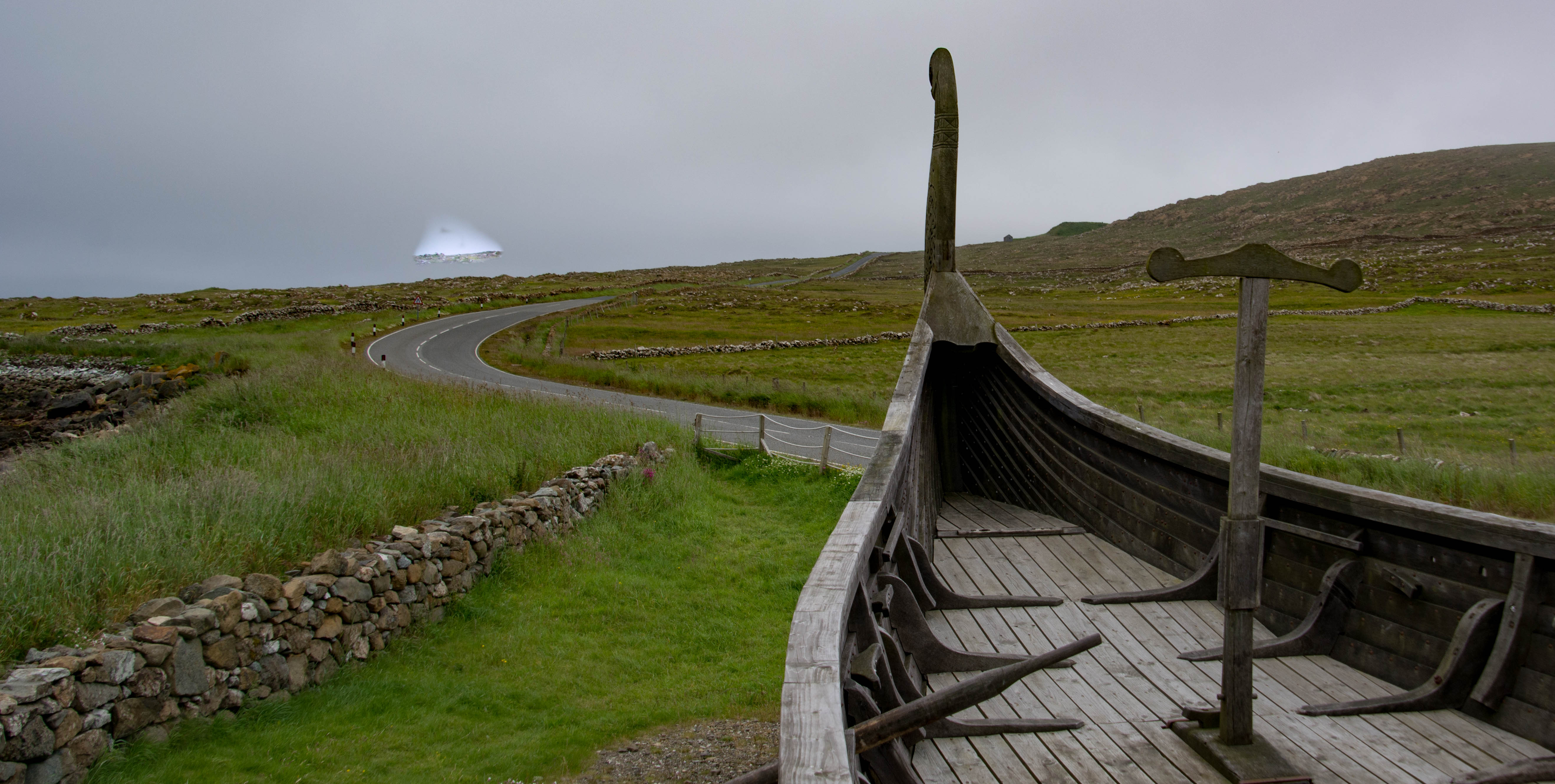 Two final sights to be seen – the superb Viking Longship that sits outside the village, beside a reconstructed Viking Longhouse. Unst was the first landfall for the Norsemen and over 60 Viking sites have been found on the island.The longship is a faithful replica of the fabulous Gokstad ship on display in Oslo (which I saw a year ago after the Greenland trip.) A little set of ladders allowed me to climb inside the ship and even move the oars.The longhouse with its turf roof, was very dark inside making it a bit difficult to explore but it is quite a sight.