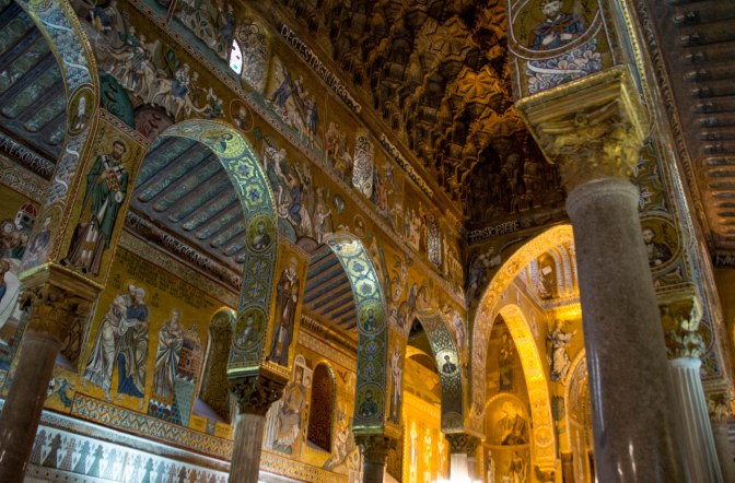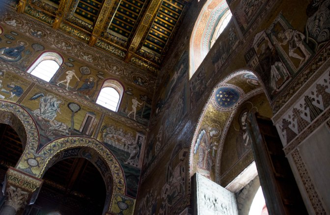 Two minutes walk away was the tremendous 12th century Cappella Palatina, the Royal Chapel of the ancient Norman Kings, set within one of Europe’s oldest Royal Palaces, the Palazzo Reale. The chapel has a monumental, overwhelming interior, the like of which I’ve never seen in all of our European travels. 2000kg of gold was used in the Byzantine decoration which is exquisite. The superb wall tiling , the marble floors and an Arab honeycomb – styled wooden ceiling, made it a place where we quickly simply sat down in awe and tried to take in the grandeur of it all.We were almost speechless after that experience.