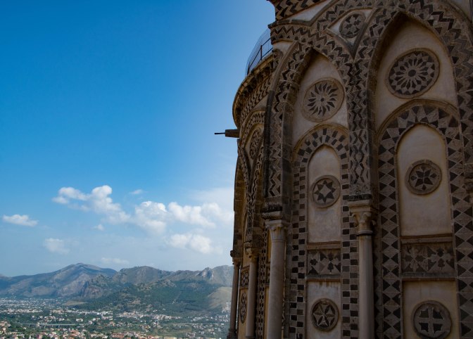 It was as awe inspiring as Cappella Palatina, very similar inside. But there were differences – the cloisters were beautiful but overall I loved the high level outdoor terrace which allowed a wander around the cathedral’s exterior; followed by tiny steps which led (one person at a time) to the even tinier belltower. The black and white striped granite and the mosaics of the exterior walls could also be admired close from here as could the sweeping views over Palermo and the mountains. What a place!