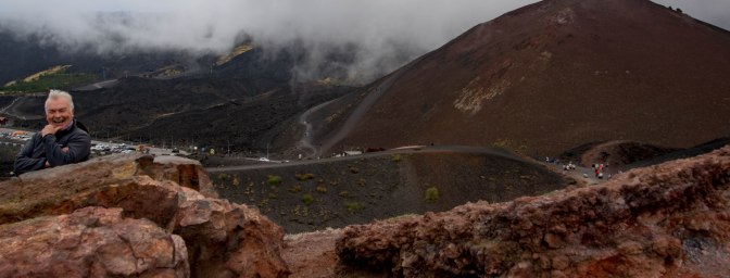 We were almost back at Cefalu on the east coast when the Mount Etna road appeared, winding its way up to the ski centre, on a good road which climbed and climbed until lava replaced the green fields and houses. Above us, the mountain – all 3,350m or nearly 11,000 feet of it – was swathed in cloud.
