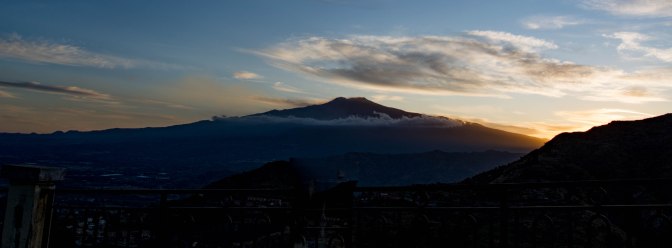 Had a LONG wait for the owner to turn up and let us into the room; but it was very nice inside. No real outlook as such but quiet and the village looked pretty, high above the coast. Got supplies in a nearby shop – that sunset over Etna having left me with future plans to return and get ourselves more organised for doing one of the guided treks up to the summit slopes – whatever the weather. I really felt we’d given up too quickly.It’s true, you always regret what you DON”T do…