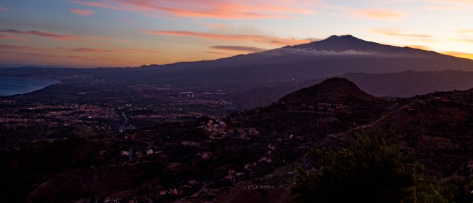Desperate, we drove up to Castelmola where there seemed to be a vacancy at a small place called Borgo Medievale. It was a tortous drive up but wow, those views! The countryside here seemed much more attractive then any we had seen so far too. Finding the place was a nightmare as was parking. Darkness was falling but not before we got some really sensational views towards Etna and the coast turning rose and lilac as the sun went down. It was worth being up here already. And – Etna was now clear!