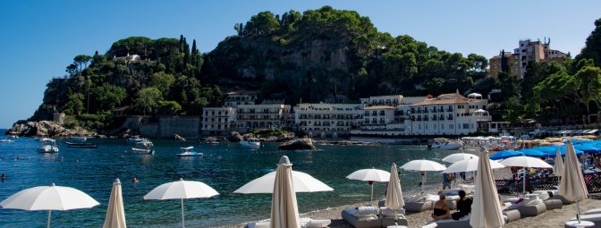 A quick change of underwear when we got back to the car (one advantage of living out of a suitcase) and it was time to make for our self catering apartment in the Bay of Mazzuro, below Taormina. It was a small bay packed with beach umbrellas, cafes and hotels but attractive in a busy resort kind of way. I didn’t fancy swimming in those crowded waters however and was glad we’d found our lonely spot earlier.
